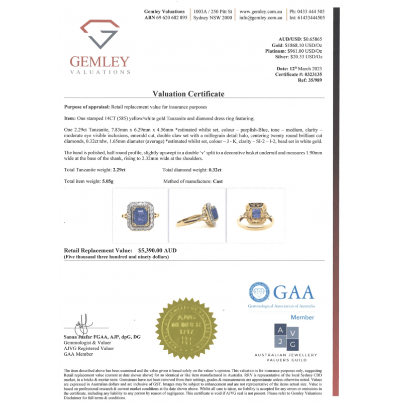 14K YELLOW GOLD, TANZANITE AND DIAMOND, ANTIQUE INSPIRED HALO RING. THE CENTRE FEATURES, ONE EMERALD CUT, MEDIUM PURPLISH-BLUE, TANZANITE (2.29CT, MODERATE EYE VISIBLE INCLUSIONS), DOUBLE FOUR CLAW SET WITH A MILLEGRAIN DETAIL HALO. SURROUNDING THE CENTRE IN A HALO ARE, 20 ROUND BRILLIANT CUT, DIAMONDS (0.32CT TDW, J-K COLOUR, SI2-I2 CLARITY), BEAD SET IN WHITE GOLD. RING SIZE O. THE TANZANITE HAS SOME SMALL NATURAL INCLUSIONS THAT HAVE REACHED THE SURFACE. Valuations Provided by an Independent Third-Party Professional Not Directly Associated With Lloyds Auctions at AUD $$5,390.00This valuation has been conducted by an independent third-party professional. The valuation amount is an assessment by the issuing valuer and does not reflect the auction value of the item. Any inquiries regarding the valuation should be directed to the issuing valuer (refer to contact details on the certificate), as Lloyds Auctions has no affiliation or influence over the valuation, the valuer, or the stated amount. Condition: Good - Refer Images 0645858+1684