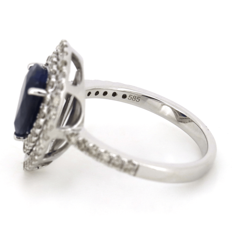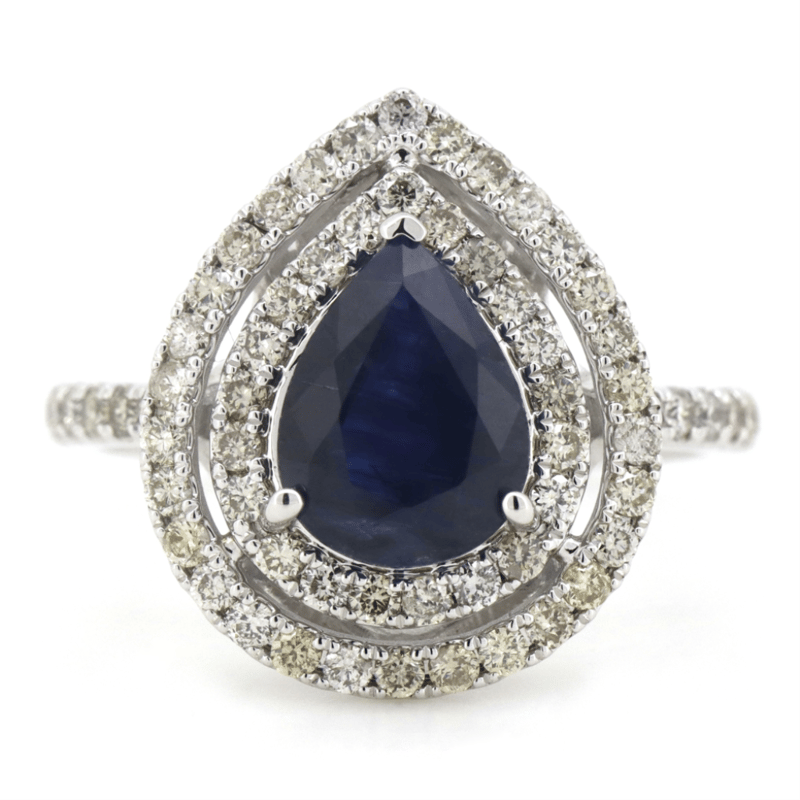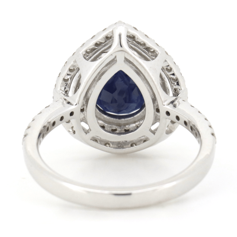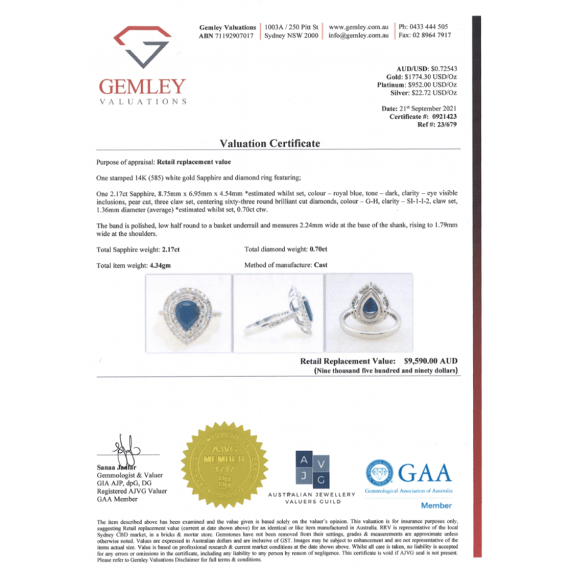 14K WHITE GOLD, BLUE SAPPHIRE AND DIAMOND, DOUBLE HALO RING. THE CENTRE FEATURES, ONE PEAR CUT, ROYAL-BLUE, SAPPHIRE (2.17CT, EYE VISIBLE INCLUSIONS), 3 CLAW SET. SURROUNDING THE CENTRE IN A DOUBLE HALO AND DECORATING THE BAND ARE, 63 ROUND BRILLIANT CUT, DIAMONDS (0.70CT TDW, G-H COLOUR, SI1-I2 CLARITY), CLAW SET. RING SIZE M. Valuations Provided by an Independent Third-Party Professional Not Directly Associated With Lloyds Auctions at AUD $$9,590.00This valuation has been conducted by an independent third-party professional. The valuation amount is an assessment by the issuing valuer and does not reflect the auction value of the item. Any inquiries regarding the valuation should be directed to the issuing valuer (refer to contact details on the certificate), as Lloyds Auctions has no affiliation or influence over the valuation, the valuer, or the stated amount. Condition: Good - Refer Images 0645858+1665