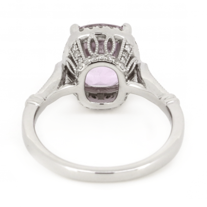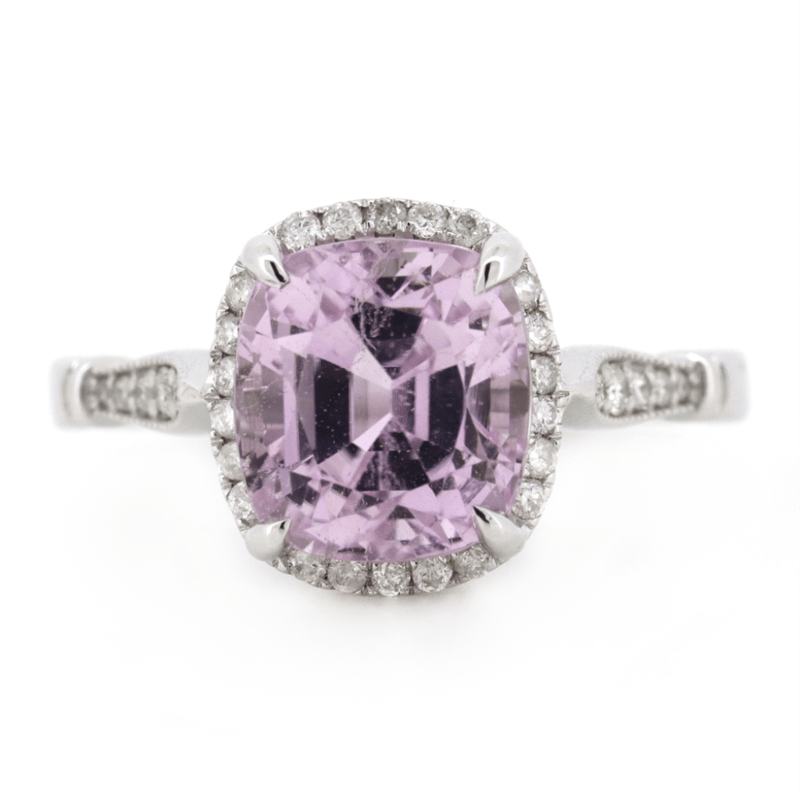 14K WHITE GOLD, KUNZITE AND DIAMOND, HALO RING. THE CENTRE FEATURES, ONE CUSHION CUT, PINKISH-PURPLE, KUNZITE (4.15CT, MINOR EYE VISIBLE INCLUSIONS), 4 CLAW SET. SURROUNDING THE CENTRE IN A HALO AND DECORATING THE BAND ARE, 52 ROUND BRILLIANT CUT, DIAMONDS (0.33CT TDW, J-K COLOUR, SI2-I2 CLARITY), MICRO-CLAW/BEAD SET WITH MILLEGRAIN DETAIL. RING SIZE N. Valuations Provided by an Independent Third-Party Professional Not Directly Associated With Lloyds Auctions at AUD $$7,190.00This valuation has been conducted by an independent third-party professional. The valuation amount is an assessment by the issuing valuer and does not reflect the auction value of the item. Any inquiries regarding the valuation should be directed to the issuing valuer (refer to contact details on the certificate), as Lloyds Auctions has no affiliation or influence over the valuation, the valuer, or the stated amount. Condition: Good - Refer Images 0645858+1685