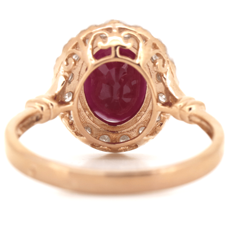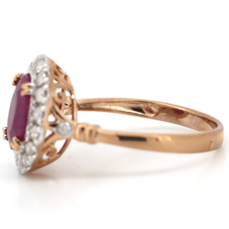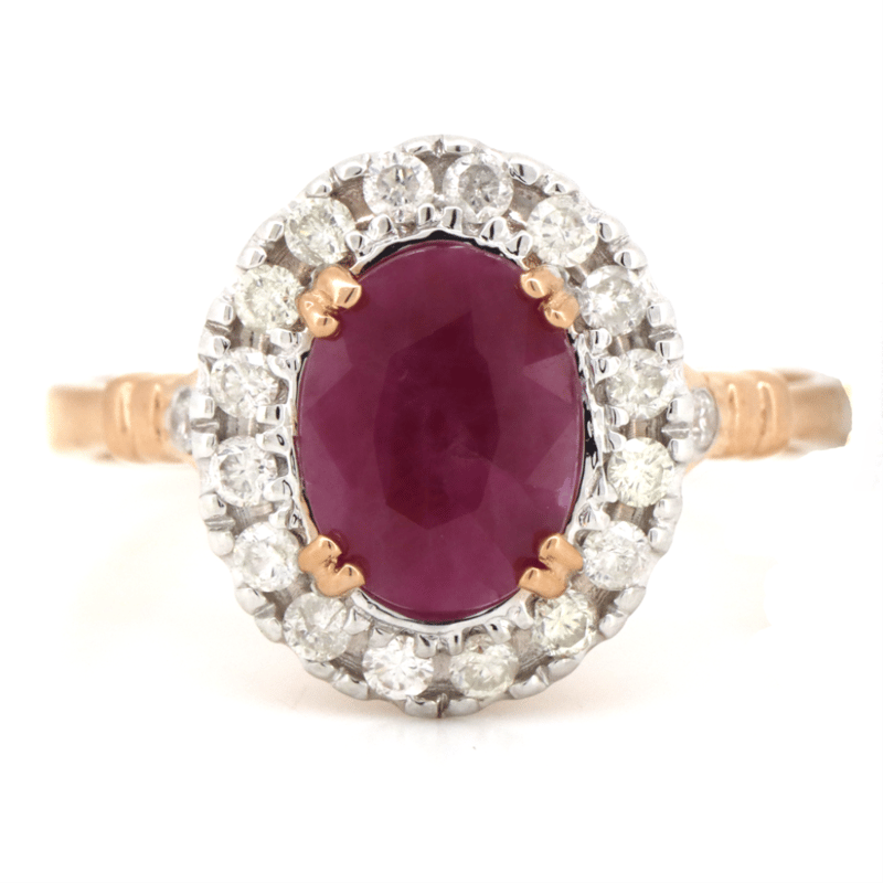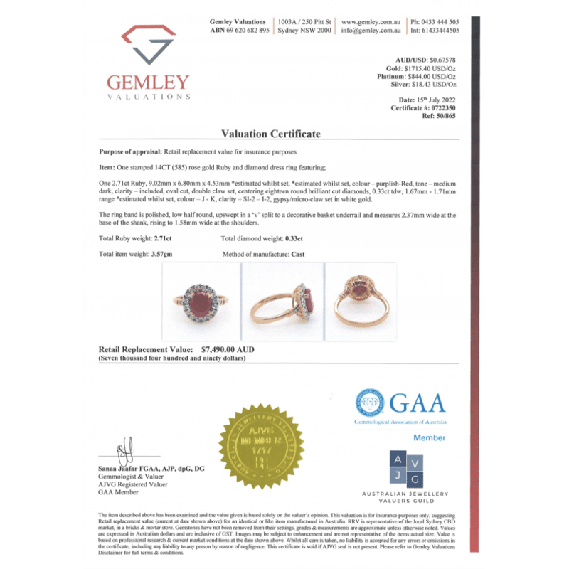 14K ROSE GOLD, RUBY AND DIAMOND, HALO RING. THE CENTRE FEATURES, ONE OVAL CUT, PURPLISH-RED, RUBY (2.71CT, INCLUDED), DOUBLE 4 CLAW SET. SURROUNDING THE CENTRE IN A HALO AND DECORATING THE SHOULDERS ARE, 18 ROUND BRILLIANT CUT, DIAMONDS (0.33CT TDW, J-K COLOUR, SI2-I2 CLARITY), GYPSY/MICRO-CLAW SET IN WHITE GOLD. Valuations Provided by an Independent Third-Party Professional Not Directly Associated With Lloyds Auctions at AUD $$7,490.00This valuation has been conducted by an independent third-party professional. The valuation amount is an assessment by the issuing valuer and does not reflect the auction value of the item. Any inquiries regarding the valuation should be directed to the issuing valuer (refer to contact details on the certificate), as Lloyds Auctions has no affiliation or influence over the valuation, the valuer, or the stated amount. Condition: Good - Refer Images 0645858+1606