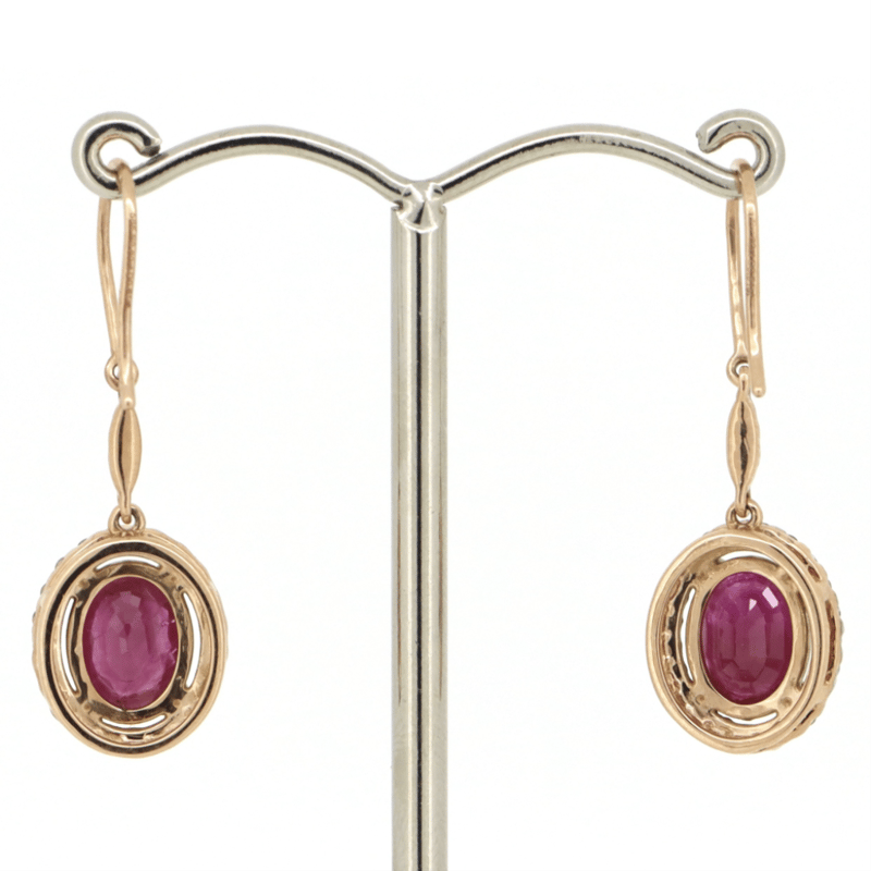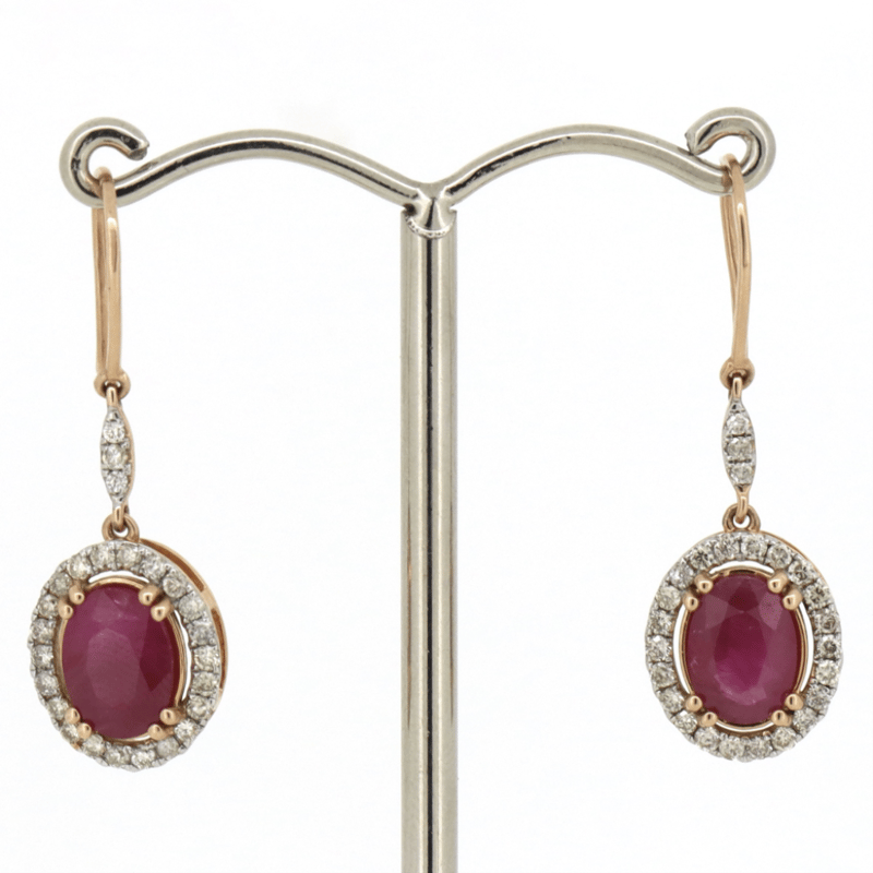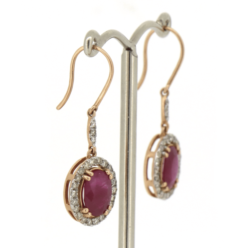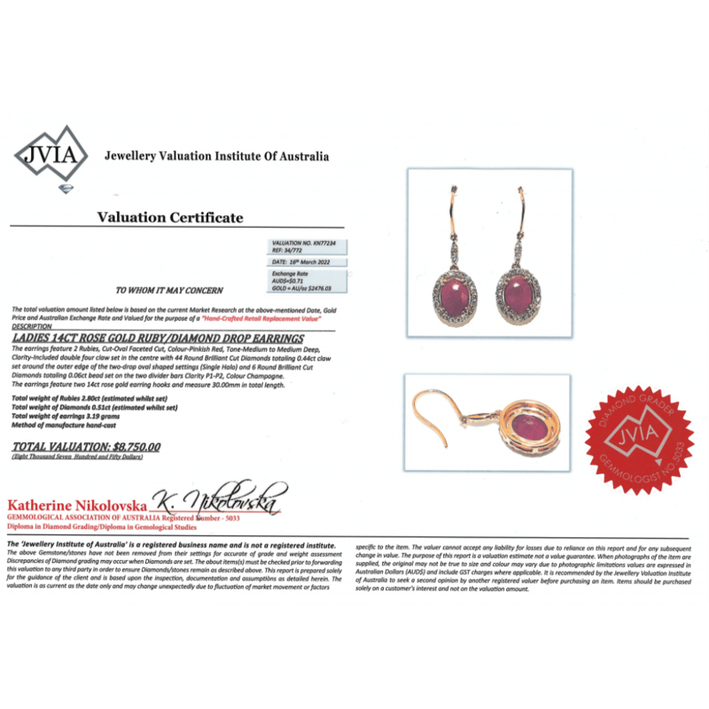 14K ROSE GOLD, RUBY AND CHAMPAGNE DIAMOND, HALO DROP EARRINGS. THE CENTRES FEATURE, 2 OVAL FACETED CUT, PINKISH-RED, RUBIES (2.80CT TSW, INCLUDED), DOUBLE 4 CLAW SET. SURROUNDING THE CENTRES IN HALOS AND DECORATING THE DROPS ARE, 50 ROUND BRILLIANT CUT, CHAMPAGNE, DIAMONDS (0.51CT TDW, P1-P2 CLARITY), CLAW/BEAD SET. THE EARRINGS HAVE SHEPHERD HOOKS. Valuations Provided by an Independent Third-Party Professional Not Directly Associated With Lloyds Auctions at AUD $$8,750.00This valuation has been conducted by an independent third-party professional. The valuation amount is an assessment by the issuing valuer and does not reflect the auction value of the item. Any inquiries regarding the valuation should be directed to the issuing valuer (refer to contact details on the certificate), as Lloyds Auctions has no affiliation or influence over the valuation, the valuer, or the stated amount. Condition: Good - Refer Images 0645858+1616