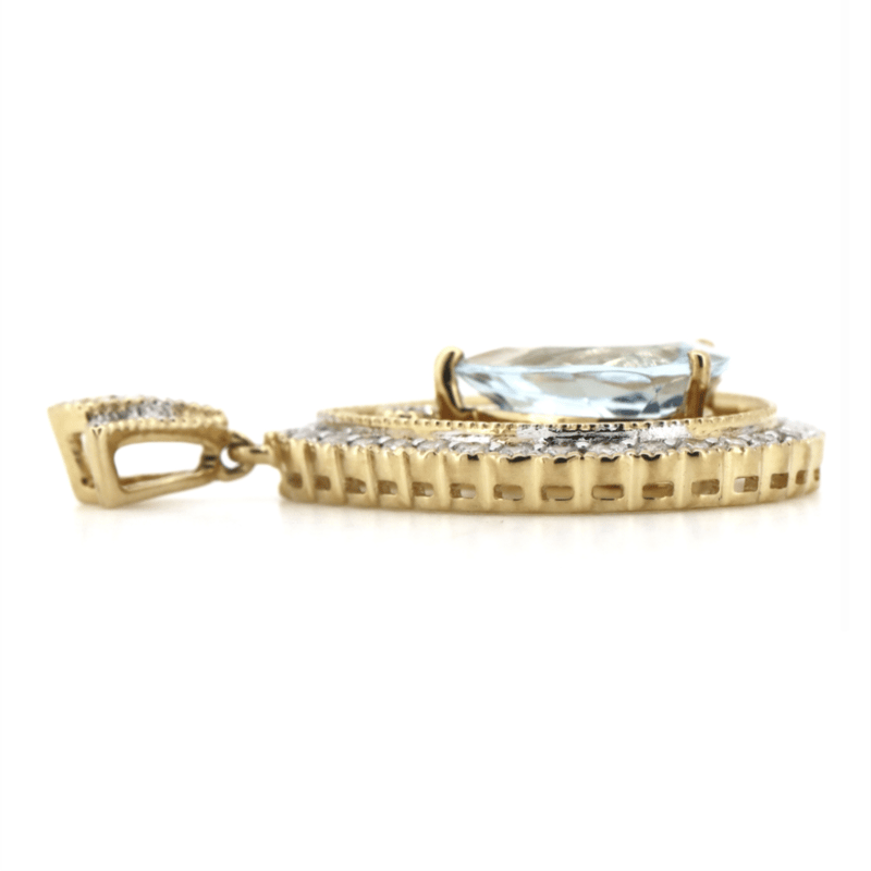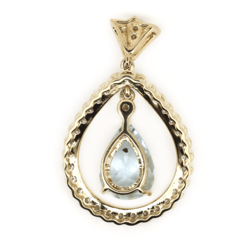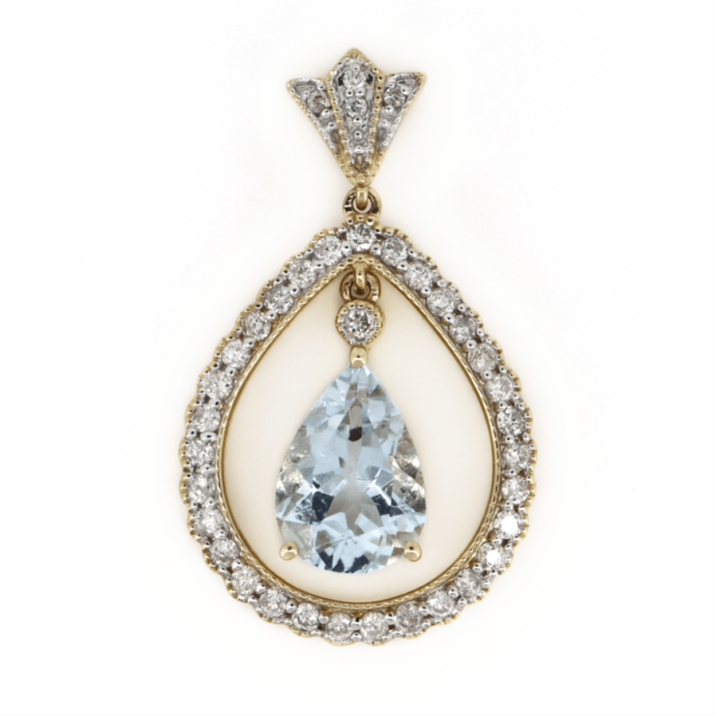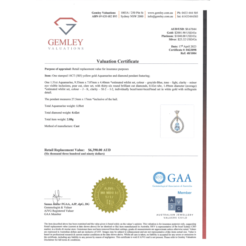 14K YELLOW GOLD, AQUAMARINE AND DIAMOND, DECORATIVE PENDANT. THE DESIGN FEATURES, ONE PEAR CUT, LIGHT GREYISH-BLUE, AQUAMARINE (1.51CT, MINOR EYE VISIBLE INCLUSIONS), 3 CLAW SET. SURROUNDING THE CENTRE IN A HALO AND DECORATING THE BAIL ARE, 36 ROUND BRILLIANT CUT, DIAMONDS (0.42CT TDW, J-K COLOUR, SI2-I2 CLARITY), BEZEL/BEAD SET. Valuations Provided by an Independent Third-Party Professional Not Directly Associated With Lloyds Auctions at AUD $$6,390.00This valuation has been conducted by an independent third-party professional. The valuation amount is an assessment by the issuing valuer and does not reflect the auction value of the item. Any inquiries regarding the valuation should be directed to the issuing valuer (refer to contact details on the certificate), as Lloyds Auctions has no affiliation or influence over the valuation, the valuer, or the stated amount. Condition: Good - Refer Images 0645858+1681