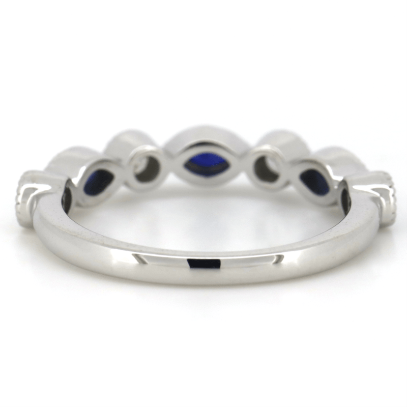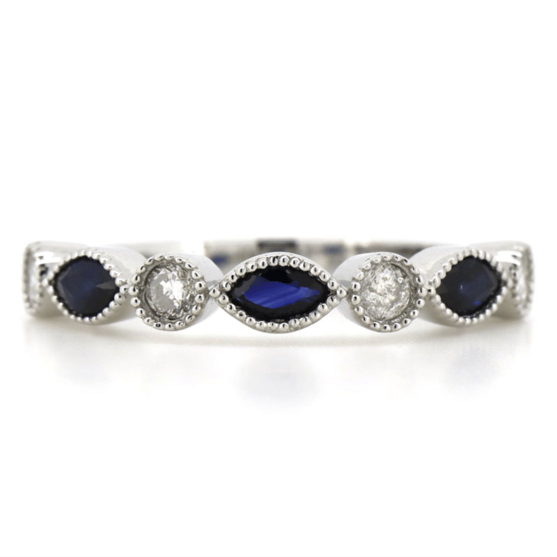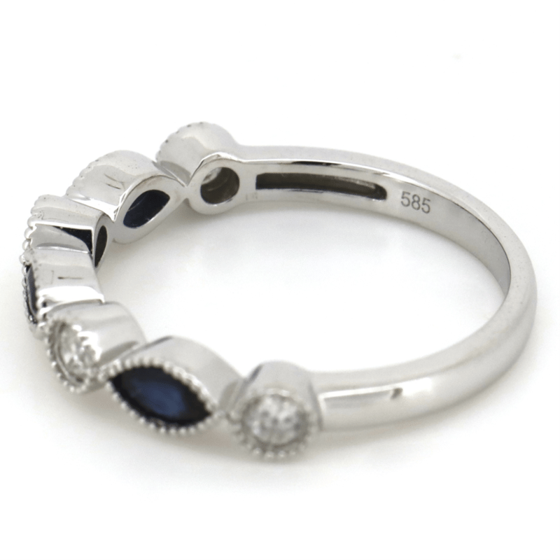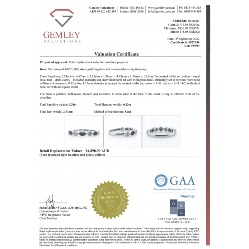 14K WHITE GOLD, BLUE SAPPHIRE AND DIAMOND, DRESS RING. THE CENTRE FEATURES, 3 MARQUISE CUT, DARK ROYAL BLUE, SAPPHIRES (0.38CT TSW, INCLUDED), BEZEL SET WITH MILLEGRAIN DETAIL. ALTERNATING BETWEEN ARE, 4 ROUND BRILLIANT CUT, DIAMONDS (0.23CT TDW, J-K COLOUR, SI2-I2 CLARITY), BEZEL SET WITH MILLEGRAIN DETAIL. RING SIZE M 1/2. Valuations Provided by an Independent Third-Party Professional Not Directly Associated With Lloyds Auctions at AUD $$4,890.00This valuation has been conducted by an independent third-party professional. The valuation amount is an assessment by the issuing valuer and does not reflect the auction value of the item. Any inquiries regarding the valuation should be directed to the issuing valuer (refer to contact details on the certificate), as Lloyds Auctions has no affiliation or influence over the valuation, the valuer, or the stated amount. Condition: Good - Refer Images 0645858+1694