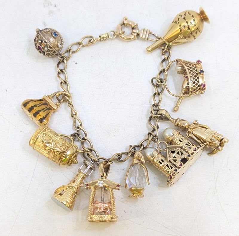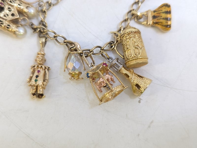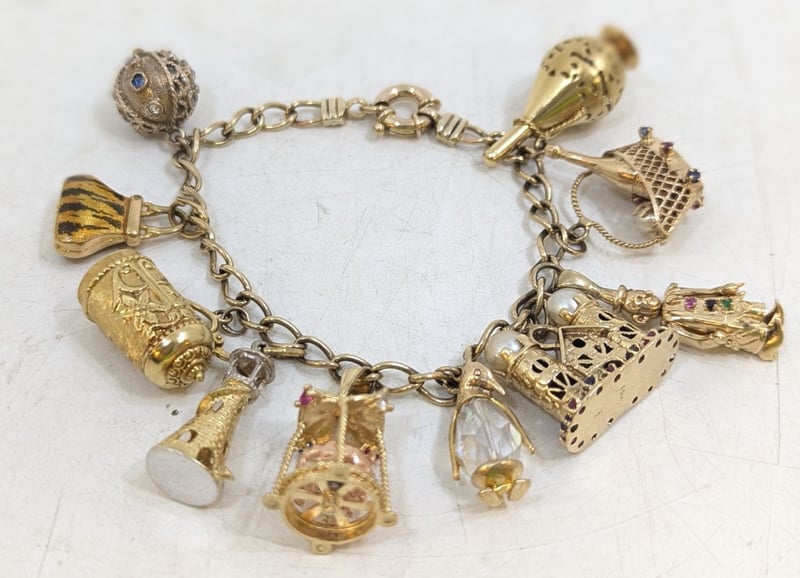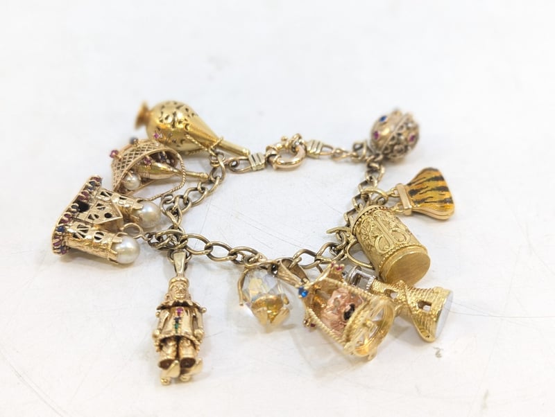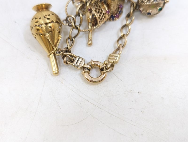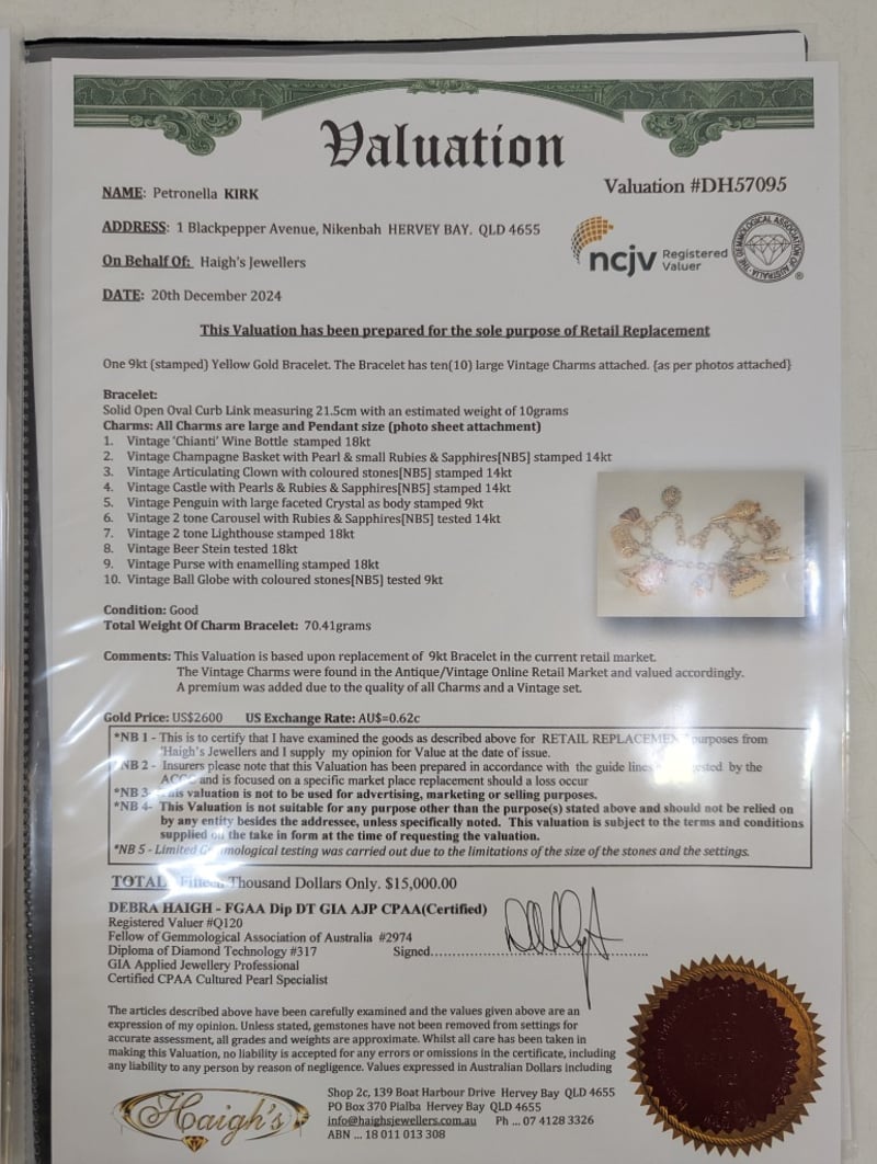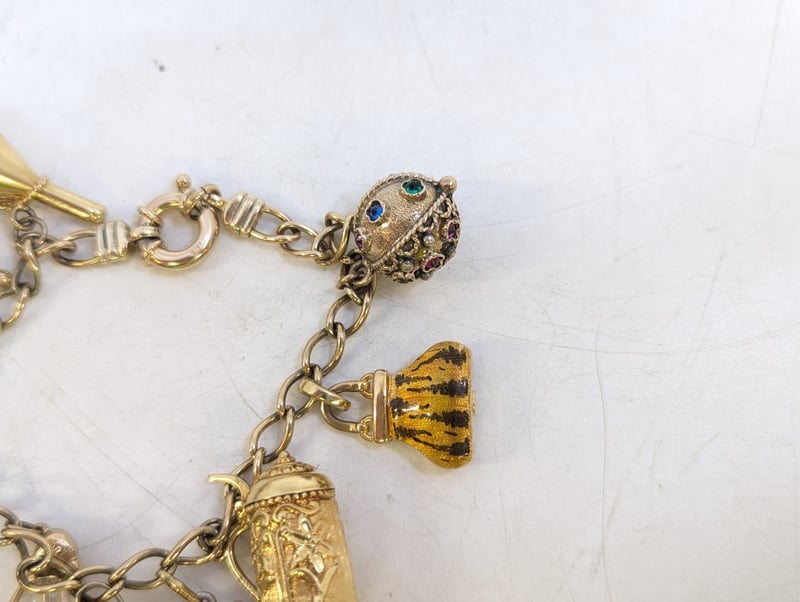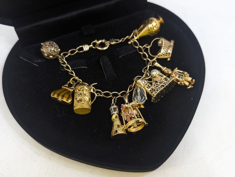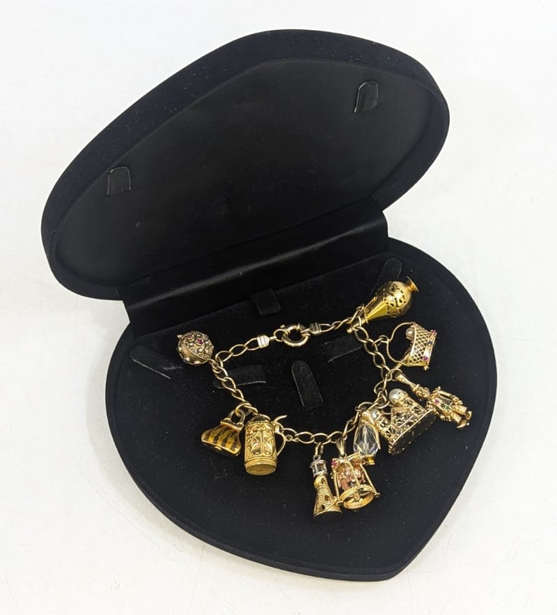 9K YELLOW GOLD BRACELET WITH CHARMS Includes Ten Charms With Stamps, Please Refer To Evaluation For More Information Total Item Weight: 70.41g Markings: Stamped Carat On Clasp Condition: Good - Refer To Images This valuation has been conducted by an independent third-party professional. The valuation amount is an assessment by the issuing valuer and does not reflect the auction value of the item. Any inquiries regarding the valuation should be directed to the issuing valuer (refer to contact details on the certificate), as Lloyds Auctions has no affiliation or influence over the valuation, the valuer, or the stated amount. Insurance Replacement Valuation Amount: $15,000.00 584989+1