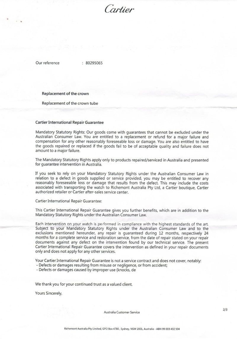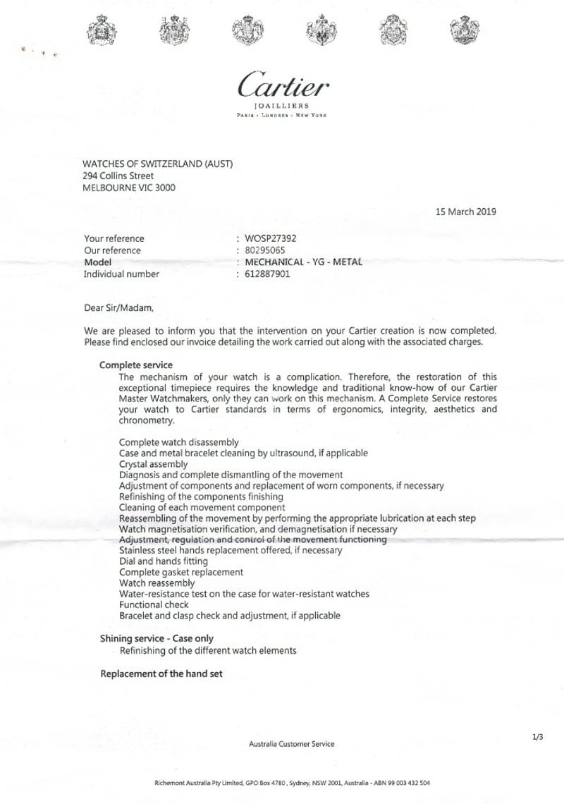 Includes Cartier Documentation, Warranty Booklet, And Service/Repair Paperwork Dated 2019 From Cartier Australia And Watches Of Switzerland Melbourne