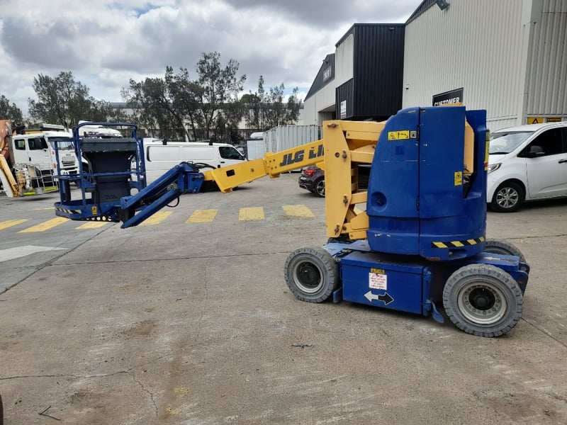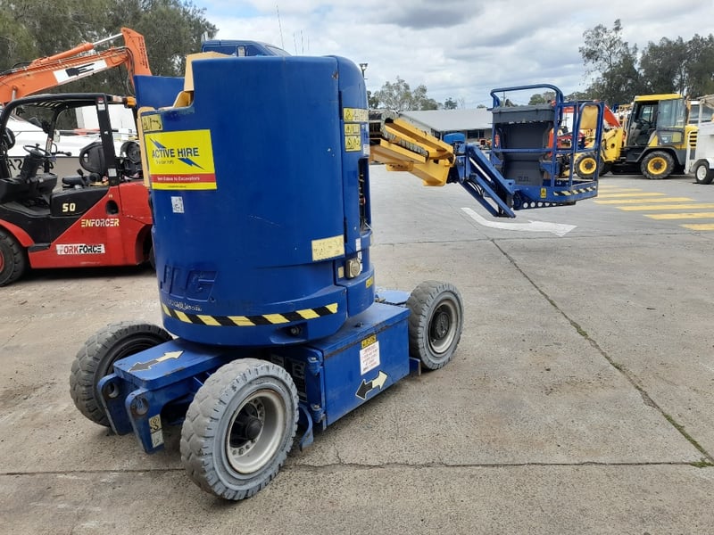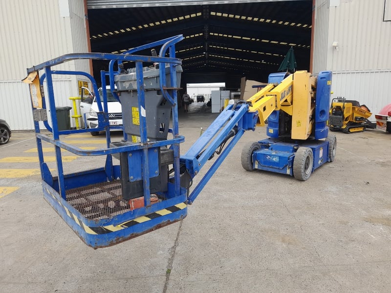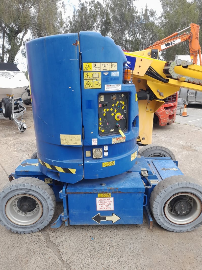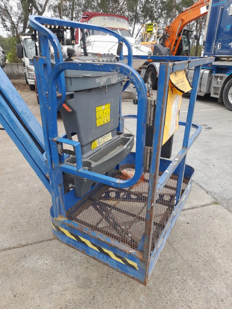 Description: Blue Knuckle boom lift, electric drive, recently replace new batteries, sluce motor drive requires attention, surface rust in place of missing paint in areas