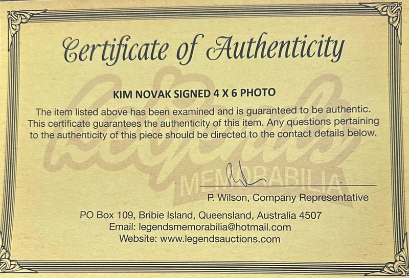 Kim Novak Personally Signed 4 X 6 Photo. Kim Novak Is An American Retired Actress And Painter. Novak Is Best Known For Her Starring Role In Alfred Hitchcock'S 1958 Thriller Vertigo. The Item Is Accompanied By A Certificate Of Authenticity.