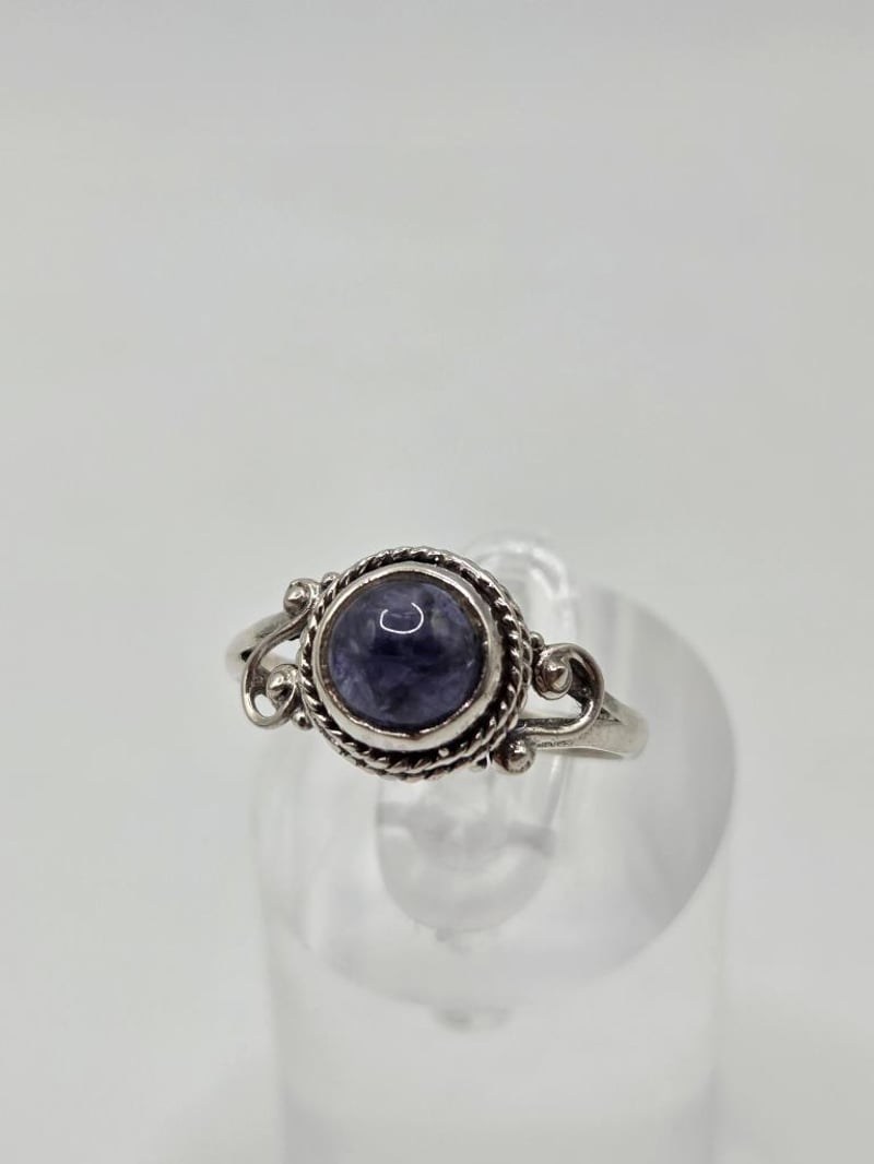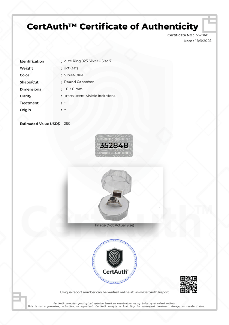 2CT IOLITE RING – ROUND CABOCHON, 925 SILVER, VIOLET-BLUE, SIZE 7, CERTAUTH™ 352848