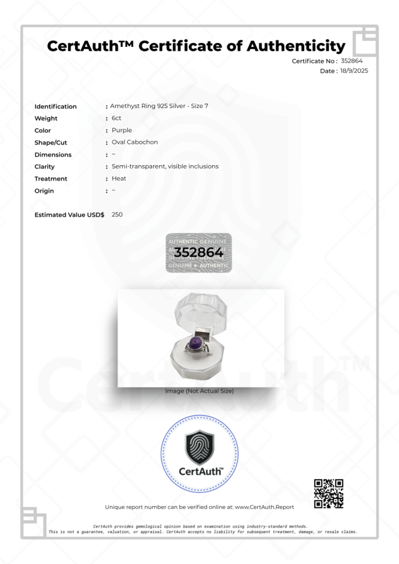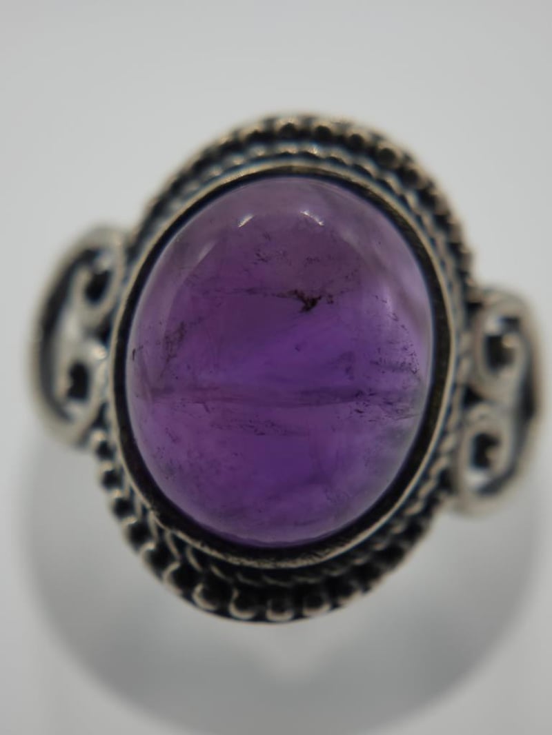 6CT AMETHYST RING – OVAL CABOCHON, 925 SILVER, SIZE 7, CERTAUTH™ 352864