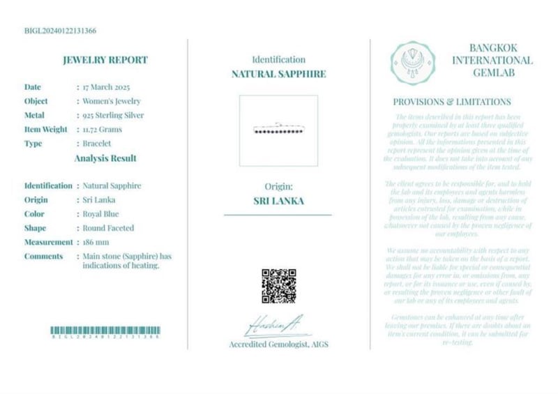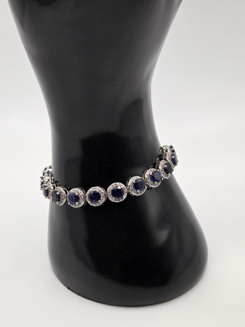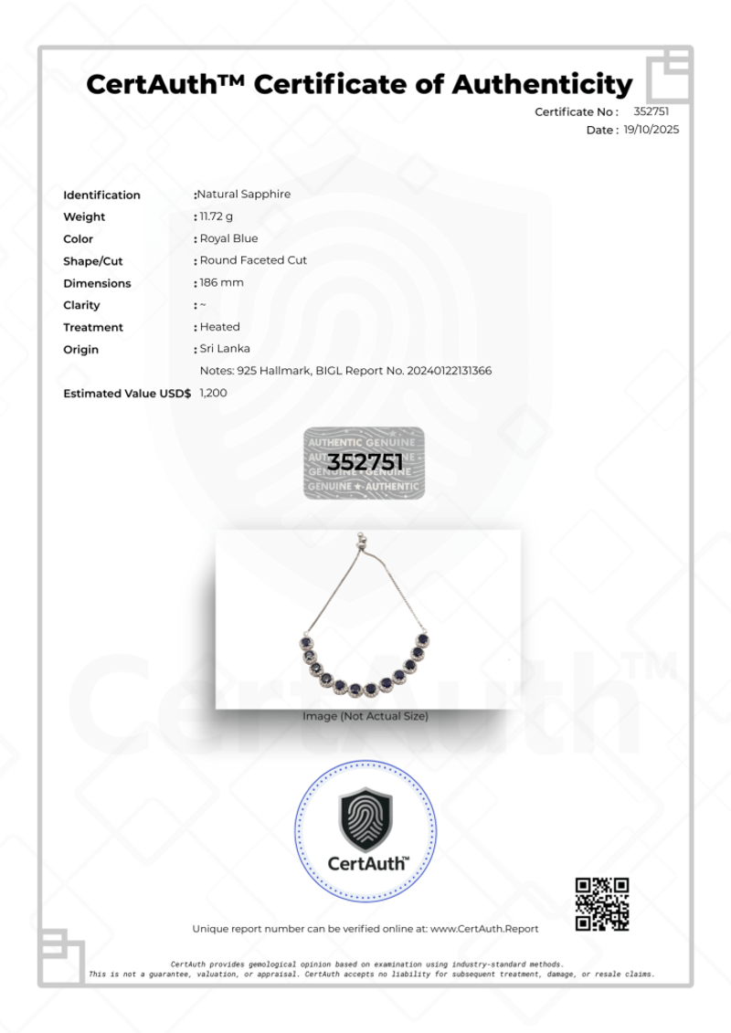 11.72G NATURAL SAPPHIRE BRACELET – ROYAL BLUE, 925 SILVER, SRI LANKAN ORIGIN, CERTAUTH™ 352751 Certified Natural Sapphire Bracelet Featuring Round Faceted Royal Blue Sapphires Of Sri Lankan Origin. Each Gem Is Heated For Enhanced Colour And Brilliance, Set In Solid 925 Sterling Silver. Supported By Dual Certification From Certauth™ And Bangkok International Gemlab (Bigl), Confirming Authenticity And Craftsmanship.Details:• Gemstone: Natural Sapphire• Total Weight: 11.72G• Colour: Royal Blue• Cut: Round Faceted• Length: 186Mm• Treatment: Heated• Clarity: Not Specified• Metal: 925 Sterling Silver (Hallmarked)• Origin: Sri Lanka• Certification: Certauth™ 352751 & Bigl Report No. 20240122131366• Estimated Value: Usd $1,200 Condition: Good - Refer Images 0488303+352751