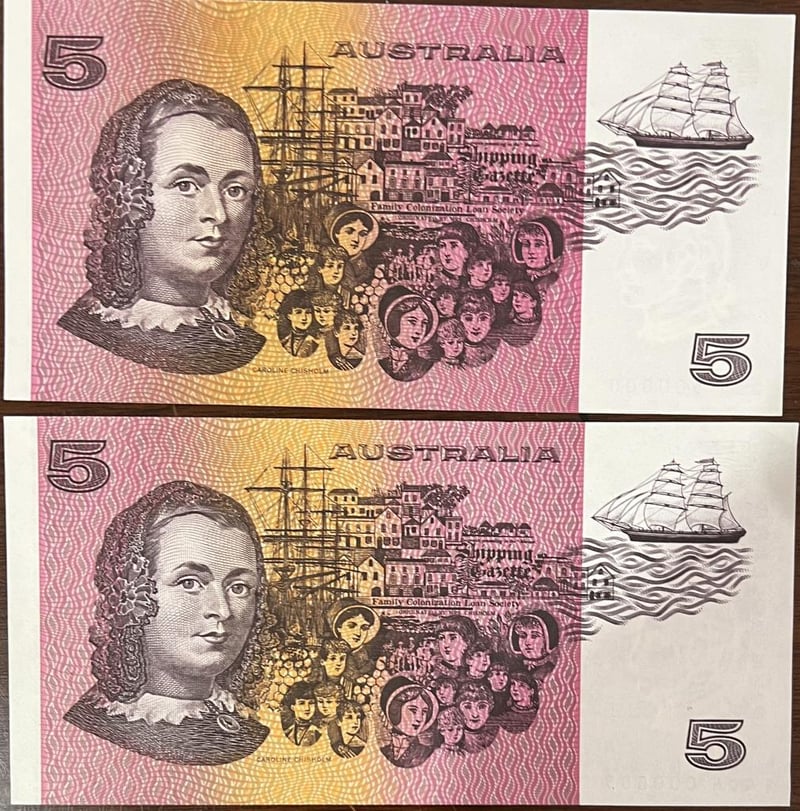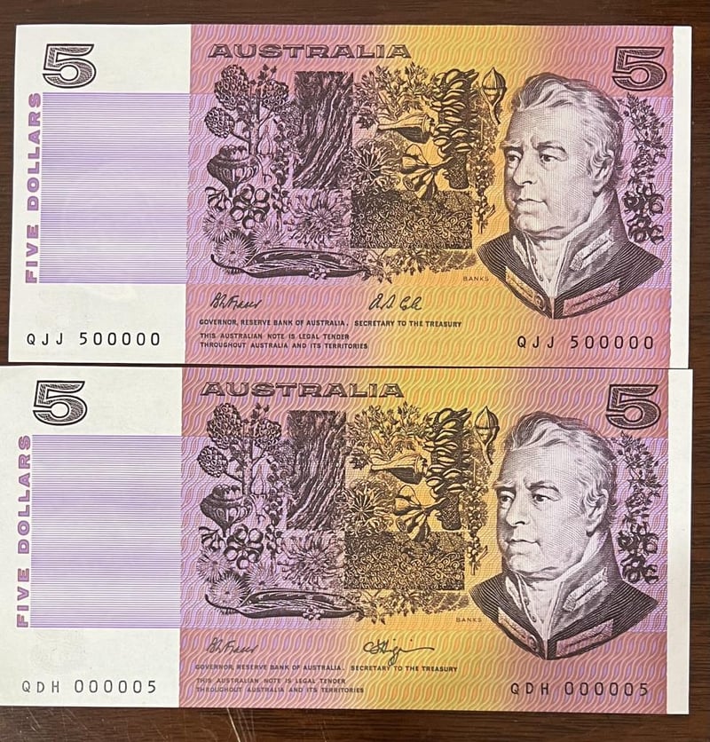 1989 & 1991 AUSTRALIA $5 RARE SERIAL PAIR QJJ 500000 & QDH 000005 UNC