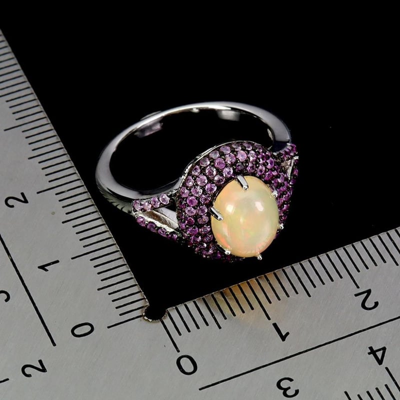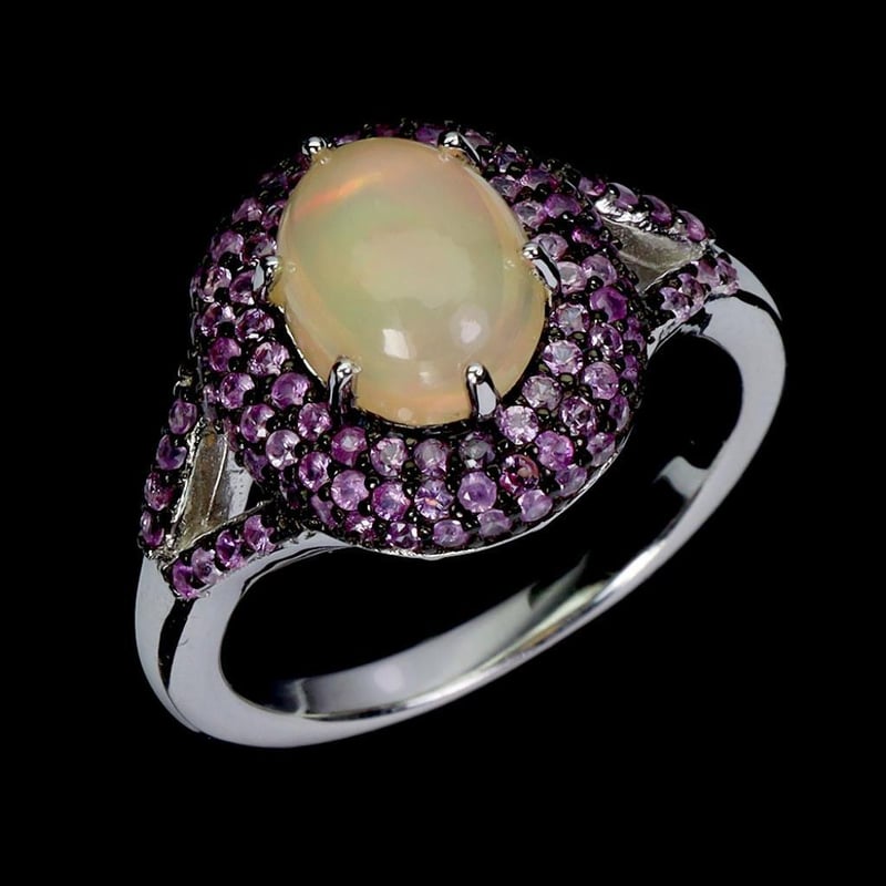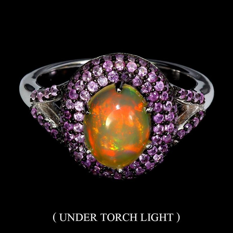 Natural Fire Opal & Diamond Cut Pick Sapphire Ring. Made In Solid Sterling Silver And Plated In 14K White Gold. Feature Natural Rainbow Fire Opal And Natural Diamond Cut Pink Sapphires. Ring Size 7