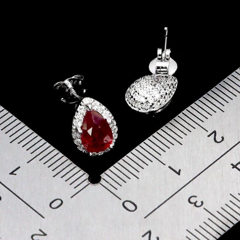 Natural Ruby Stud Earrings. Made In Solid Sterling Silver And Plated In14K White Gold. Features Natural Blood Red Pear Facet Rubies Surrounded By Sparkling Czs. Earrings Measure 10X7Mm.