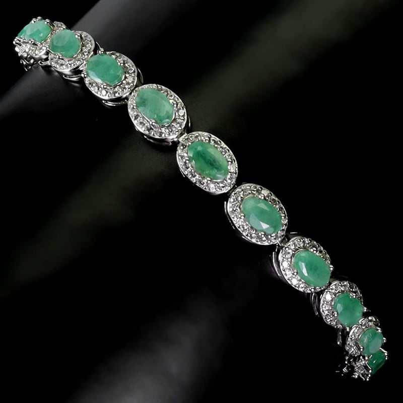 Natural Emerald Tennis Bracelet. Made In Solids Sterling Silver And Plated In14K White Gold. Features Natural Green Emeralds Surrounded By Sparlings. Bracelet Measures 8 Inches.