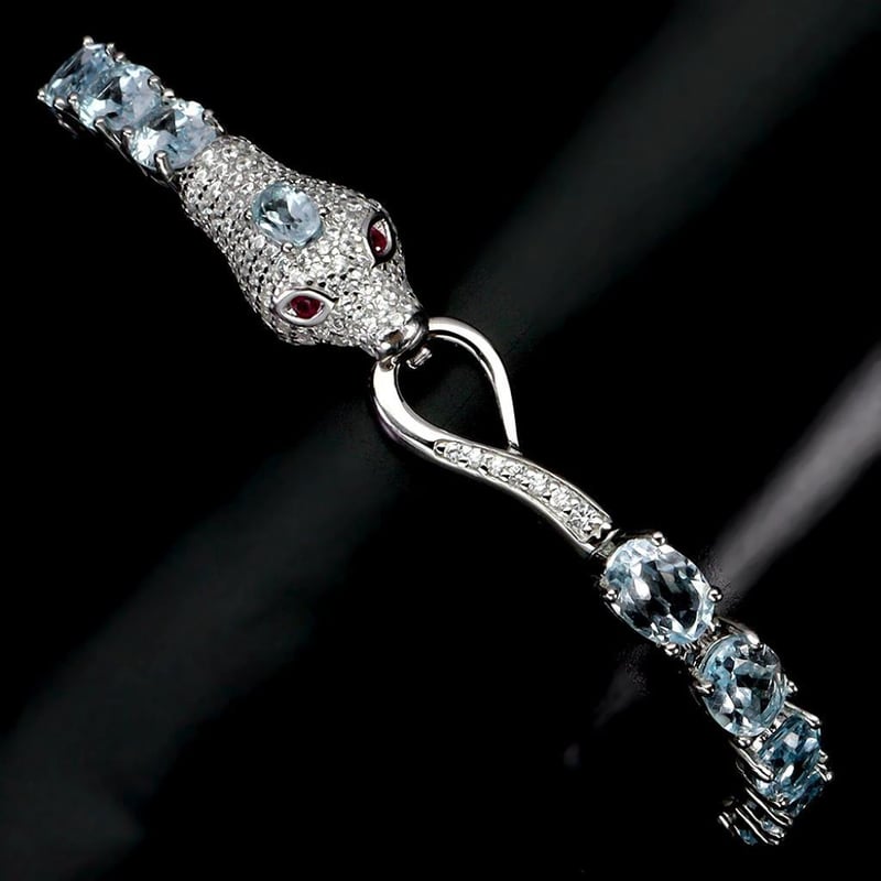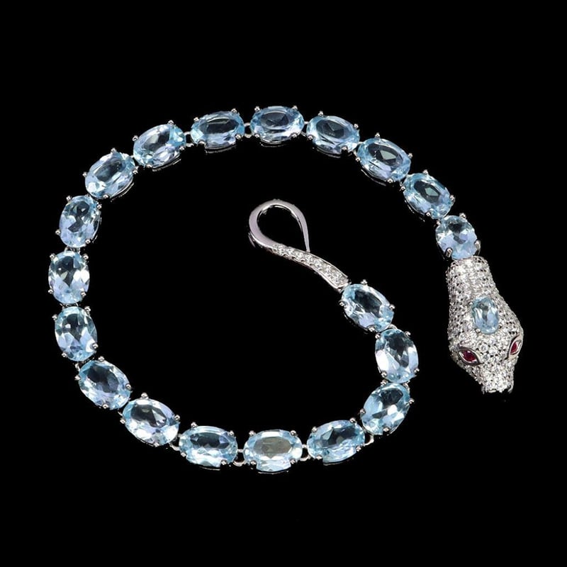 NATURAL SKY BLUE TOPAZ COBRA TENNIS BRACELET. Natural Sky Blue Topaz Cobra Tennis Bracelet. Made In Solid Sterling Silver And Plated In14K White Gold. Features Natural Sky Blue Topaz And Rubies As Eyes. Bracelet Measures 7 Inches. Condition: Good - Refer Images 0488314+8