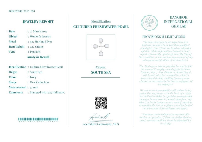 FRESHWATER PEARL PENDANT ON 925 SILVER - WITH DIGITAL CERTIFICATE Gemstone : Freshwater PearlDIGITAL CERTIFICATE Number : Bigl20240122131654Item Total Weight : 4.12 GramsMain Stone Color : IvorySize : 33Comments : Stamped With 925 Hallmark.✻ Verify Report Online At Www.Bangkokinternationalgemlab.Co Condition: Good - Refer Images 0488078+33 Digital certificate only
