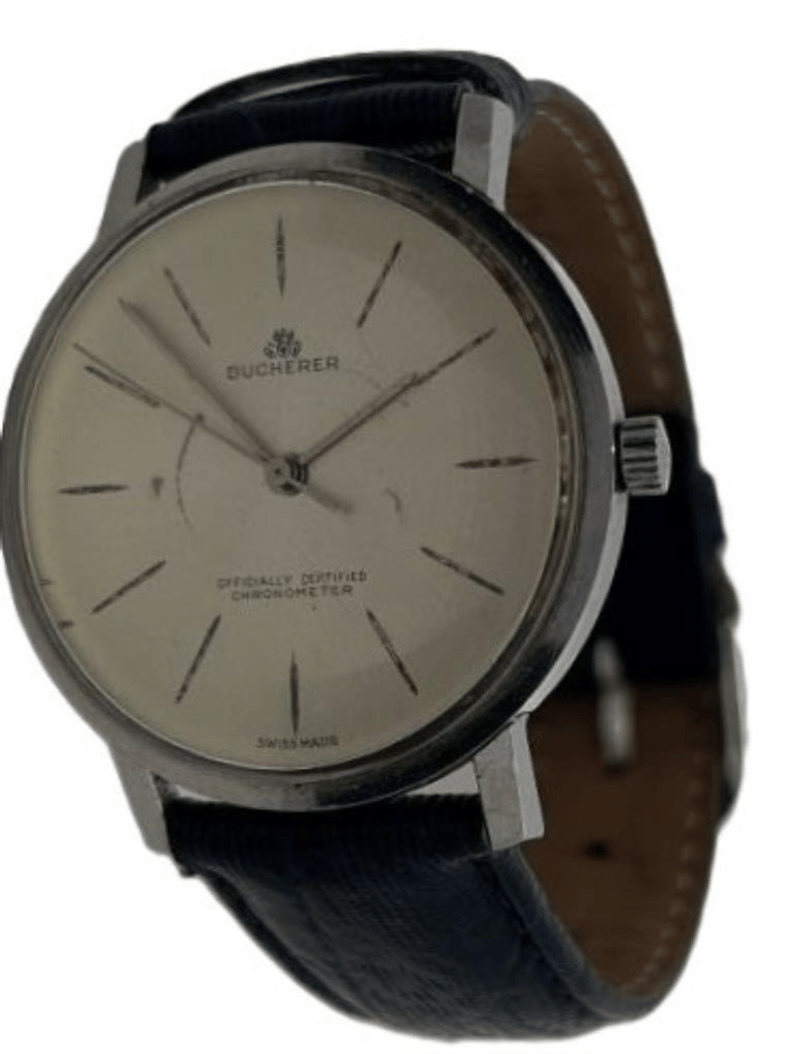 BUCHERER AUTOMATIC VINTAGE WATCH, CHAMPAGNE LINEN DIAL WITH BATON HOUR MARKERS, OFFICIALLY CERTIFIED CHRONOMETER AUTOMATIC MOVEMENT, CASE MEASURES 34MM, NAVY BLUE LEATHER STRAP WITH SILVER-TONE BUCKLE, CIRCA 1960'S. NOTE: MARKS ON DIAL SEE PHOTOS. Condition: Good - Refer To Images