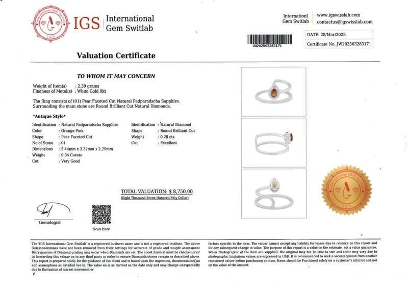9CT WHITE GOLD SAPPHIRE AND DIAMOND RING Date : 27 -03-2025 Category: Ring Comment: White Gold 9K Natural Padparadscha Sapphire :0.34 Ct. Natural Diamond : 0.28 Carat Item Weight : 2.39 G Condition: Good - Refer Images 283171 488285+283171