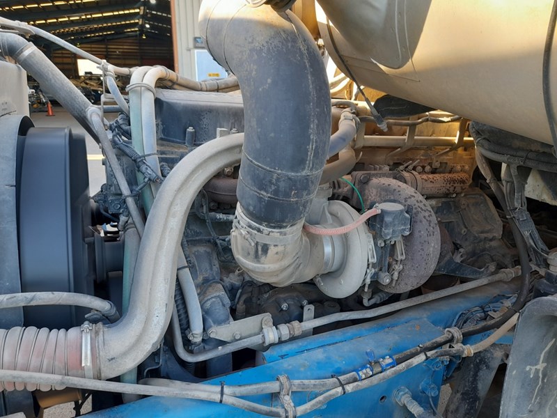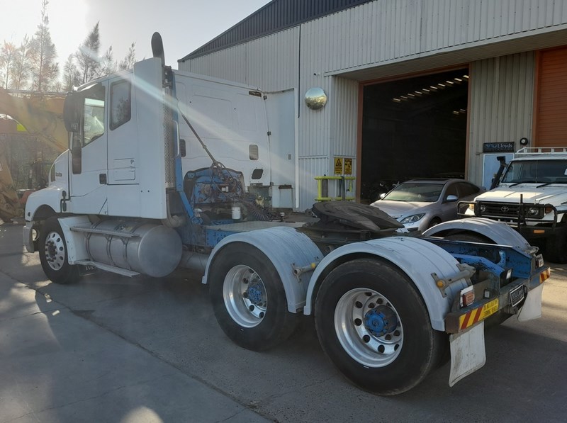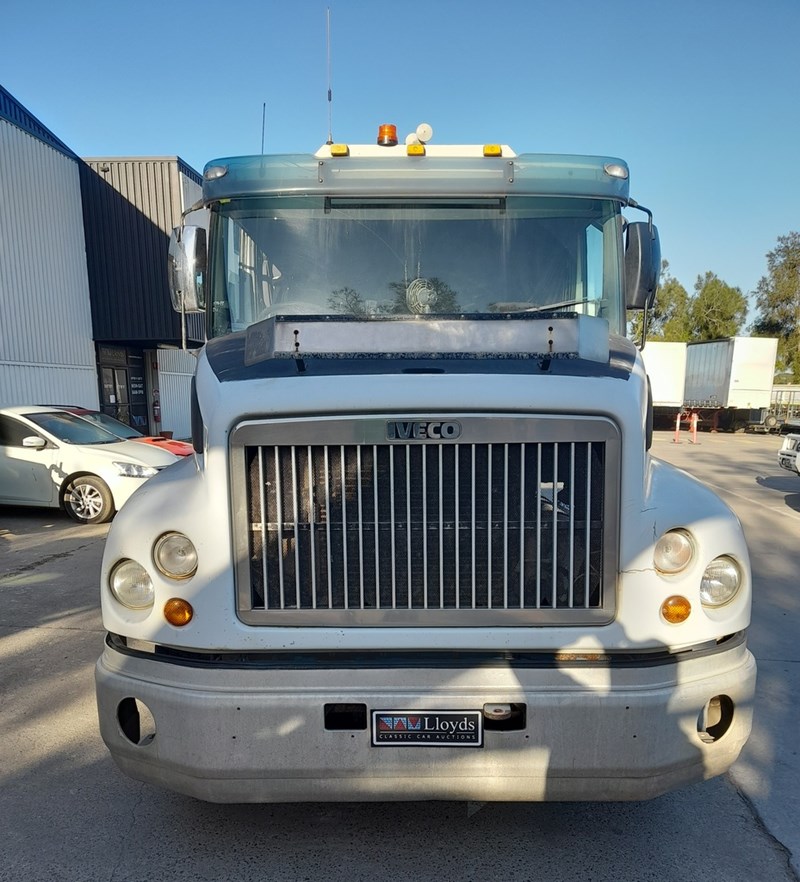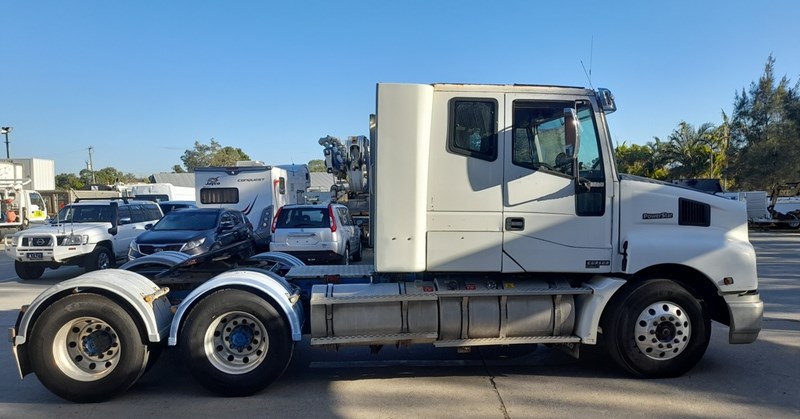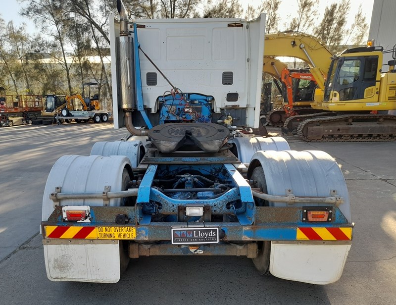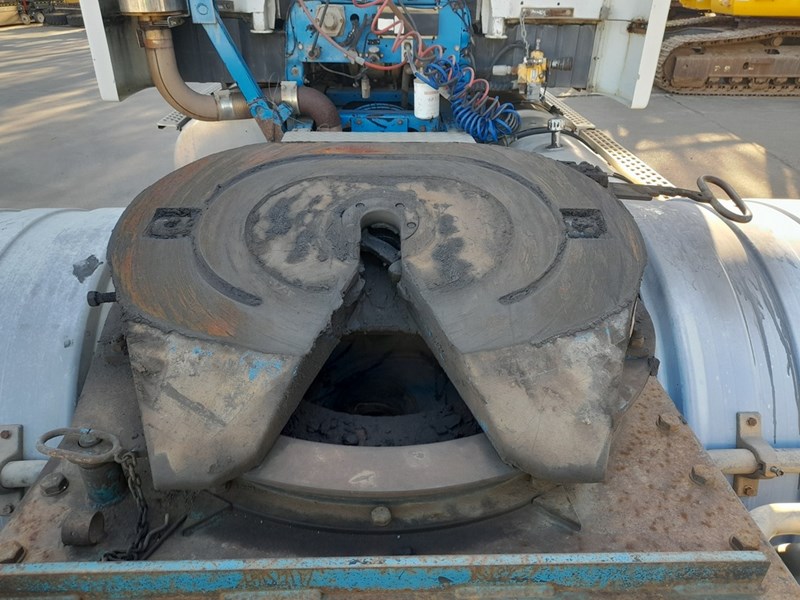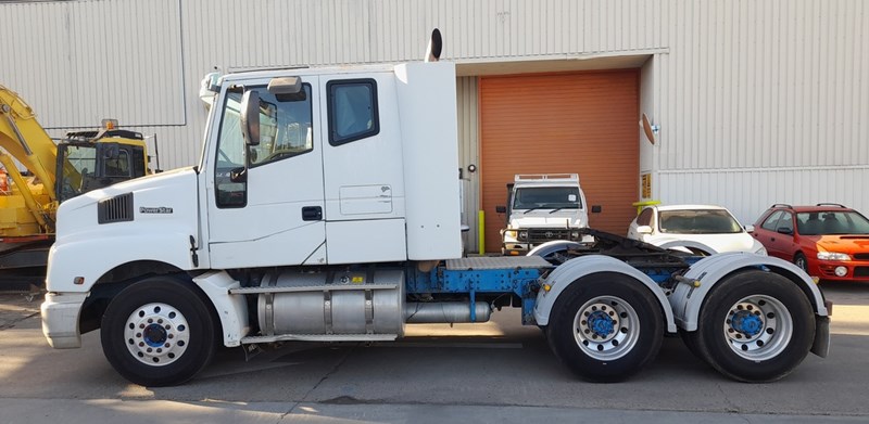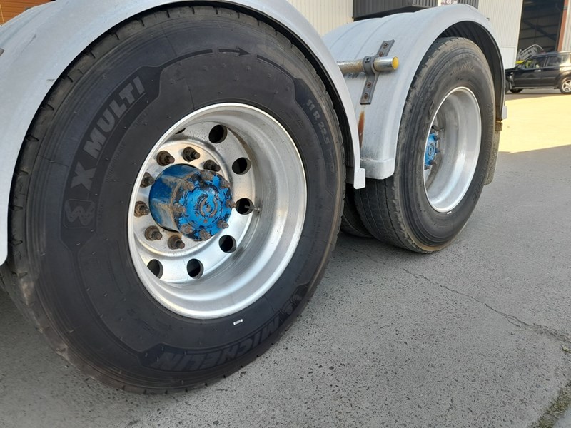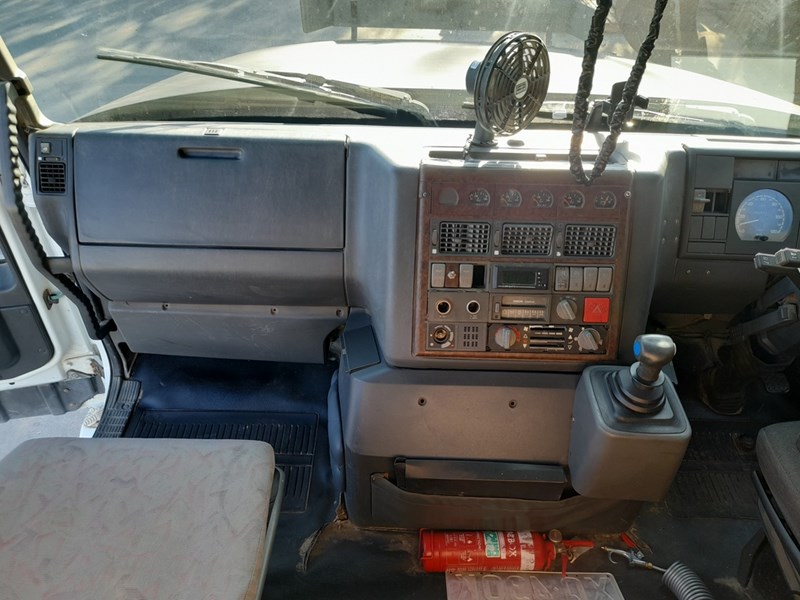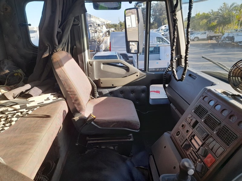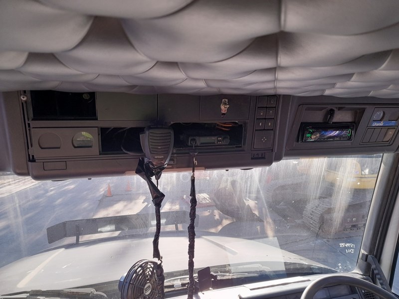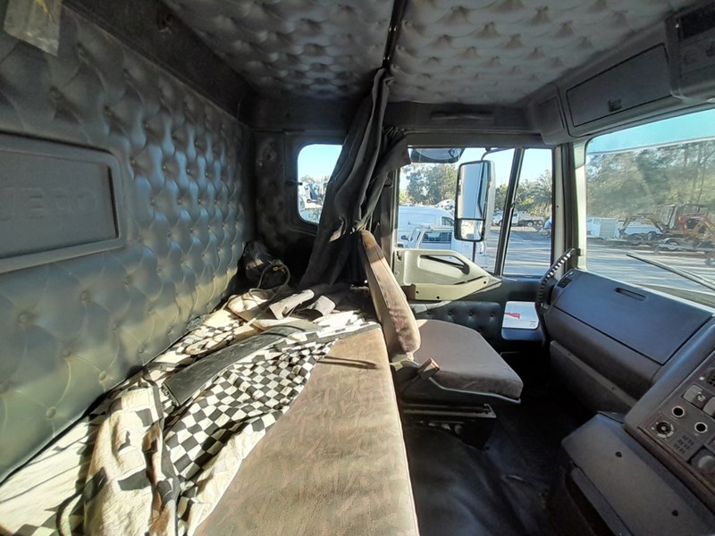 Description: White prime mover, truck, 6-cylinder turbo diesel engine, air con, power windows, cruise control, sleeper quarters with slide across curtain, side tipper and end tippers, and walking floor hydraulics, Kenwood CD player, dash fan , UHF radio