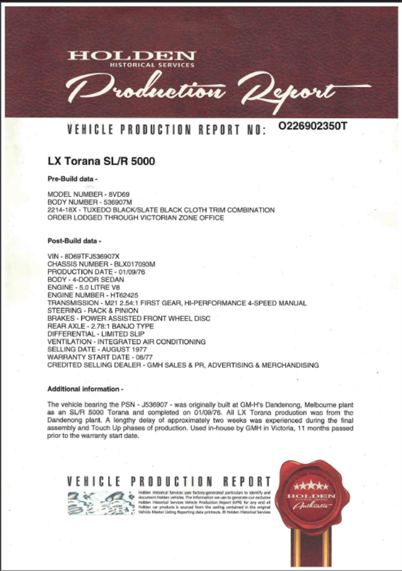 A genuine LX SLR 5000 with paperwork, provenance and presence. Presented in a highly desirable colour scheme and complete with logbooks, manuals and production report, this Torana is a rare opportunity to acquire one of Holden’s most iconic performance sedans.