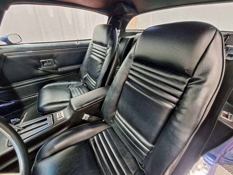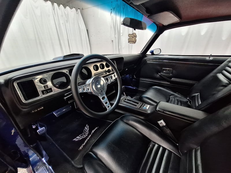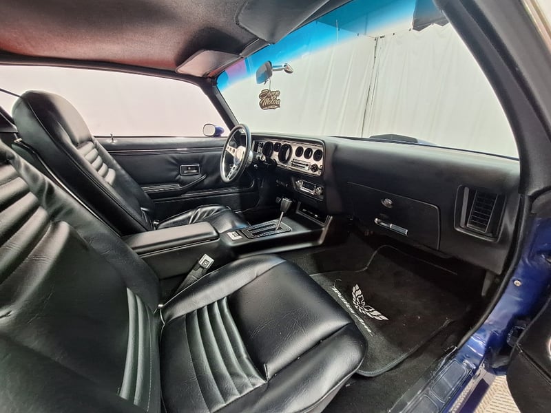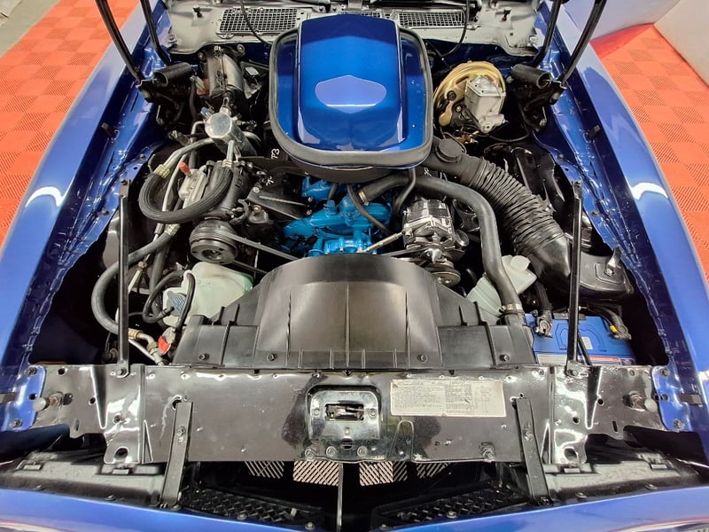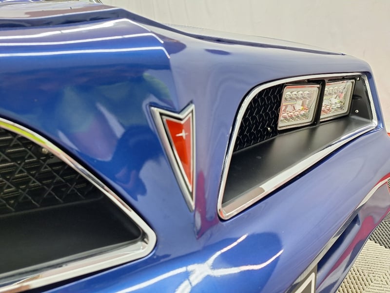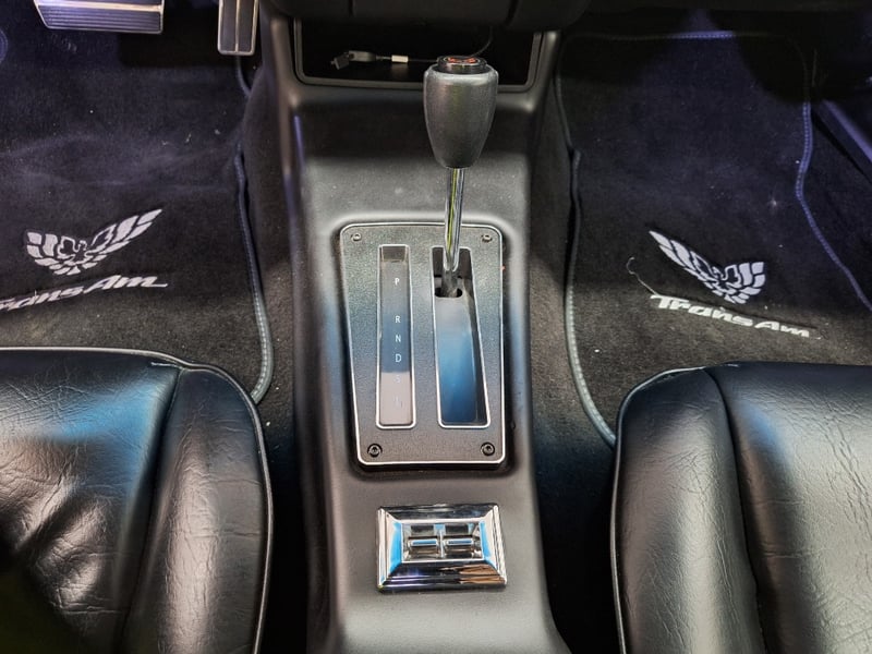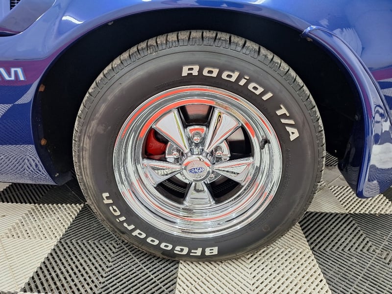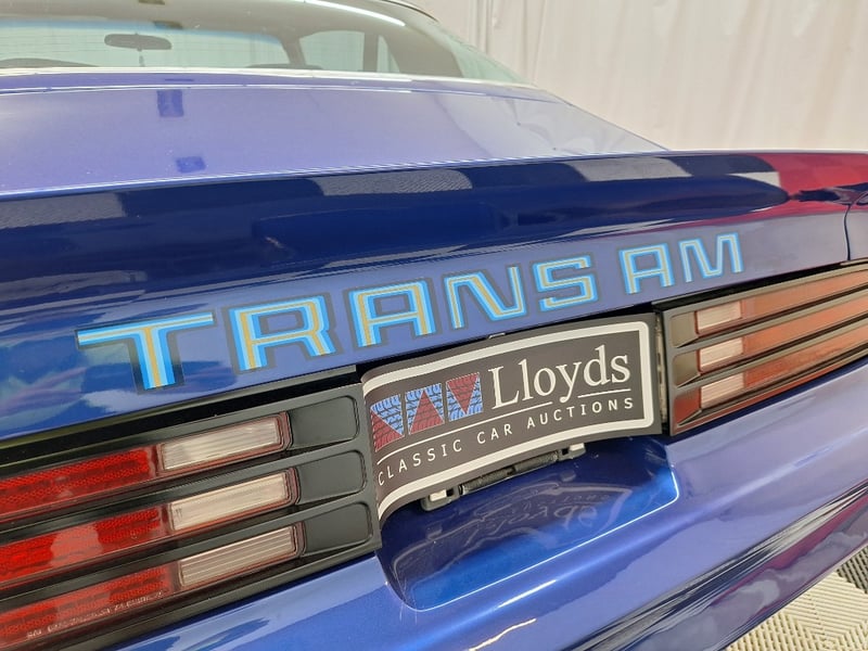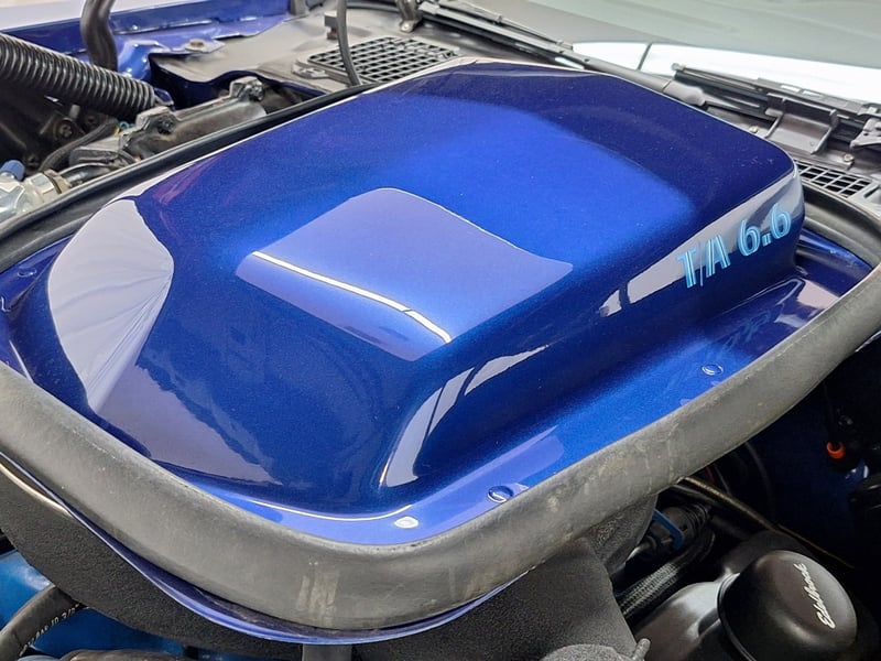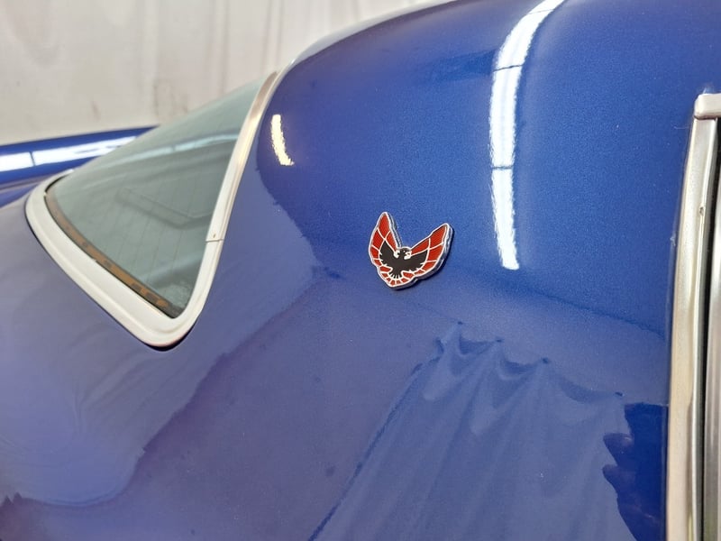 The exterior has been refinished in metallic blue and retains the hallmark Trans Am styling elements, including the large Firebird decal on the bonnet, shaker scoop with T/A 6.6 lettering, colour-coded bumpers, LED headlights, rear spoiler, and dual polished exhaust tips. The bodywork was taken back to a bare shell for repainting; however, some refinement to panel fitment and alignment would further improve presentation. A crack is noted in the upper passenger-side corner of the windscreen. The car now rides on brand-new 15-inch chrome Cragar wheels with BF Goodrich white-letter tyres.