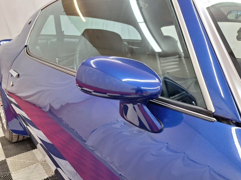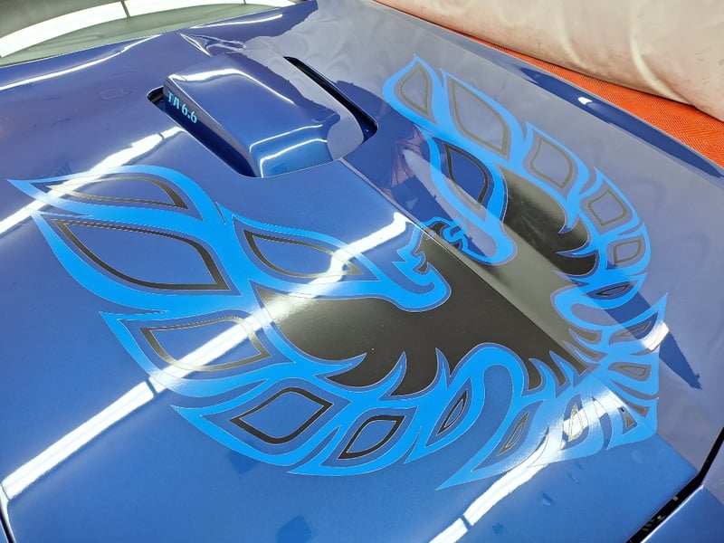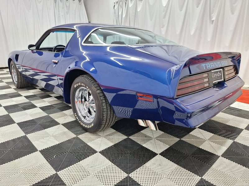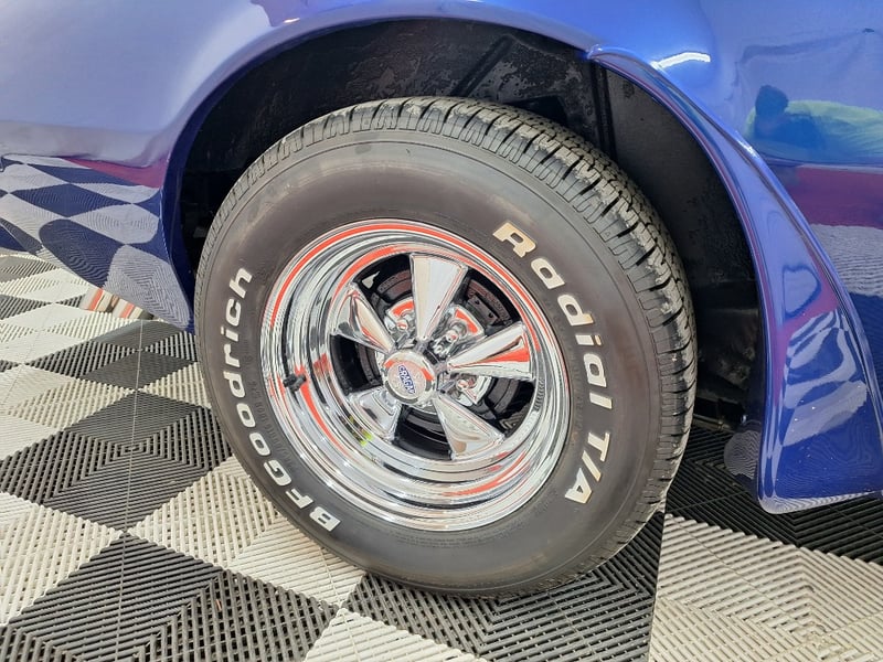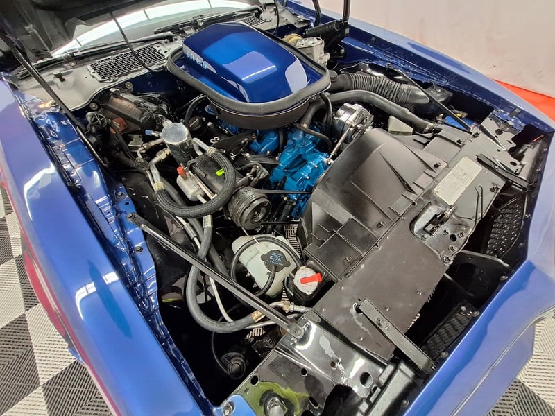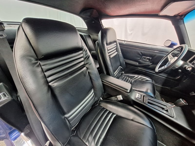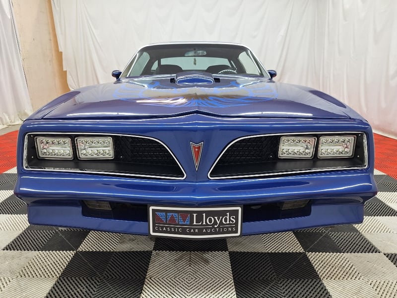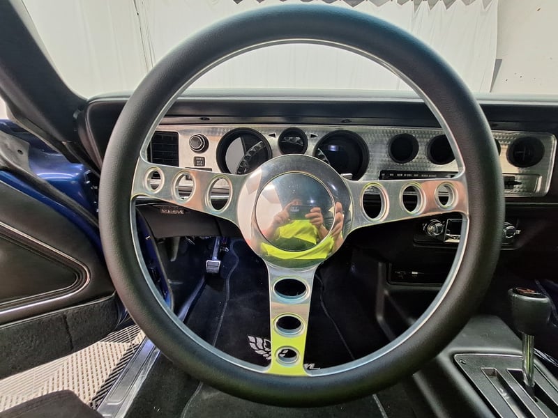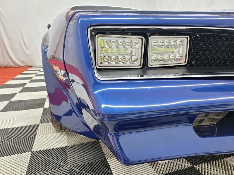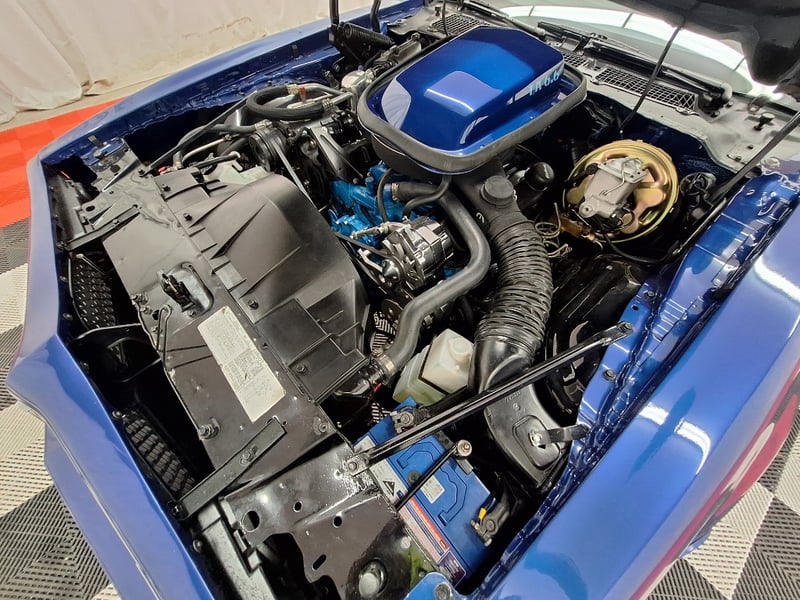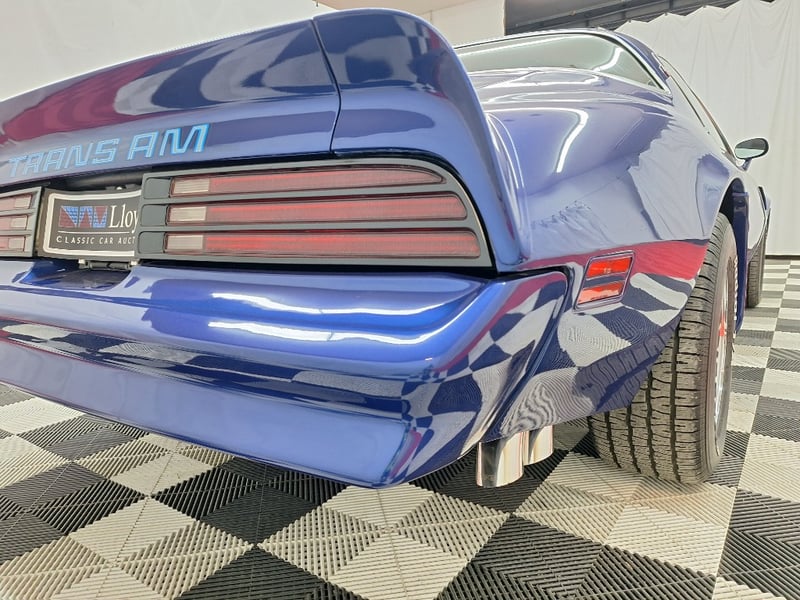 The exterior has been refinished in metallic blue and retains the hallmark Trans Am styling elements, including the large Firebird decal on the bonnet, shaker scoop with T/A 6.6 lettering, colour-coded bumpers, LED headlights, rear spoiler, and dual polished exhaust tips. The bodywork was taken back to a bare shell for repainting; however, some refinement to panel fitment and alignment would further improve presentation. A crack is noted in the upper passenger-side corner of the windscreen. The car now rides on brand-new 15-inch chrome Cragar wheels with BF Goodrich white-letter tyres.