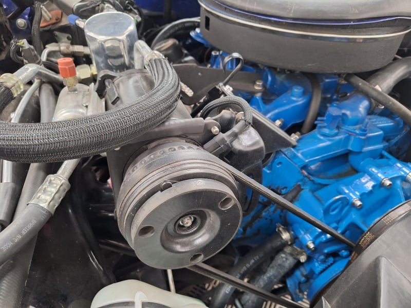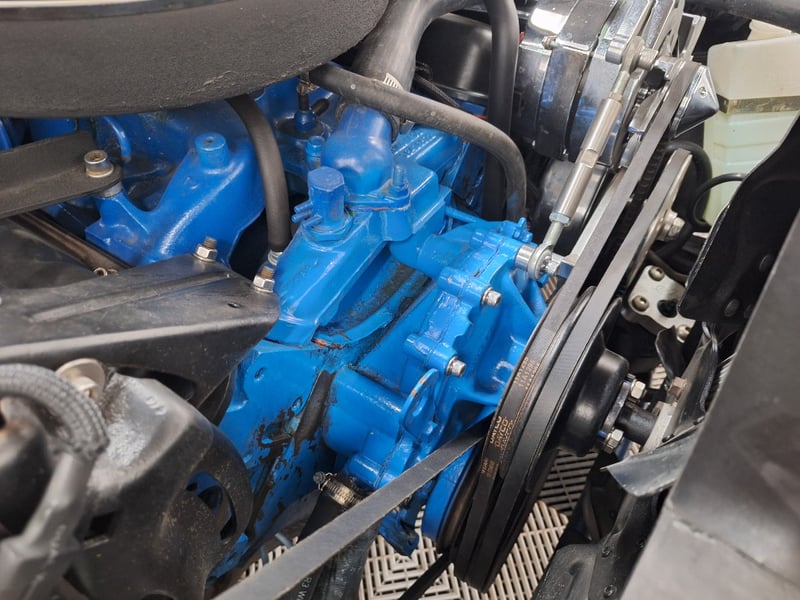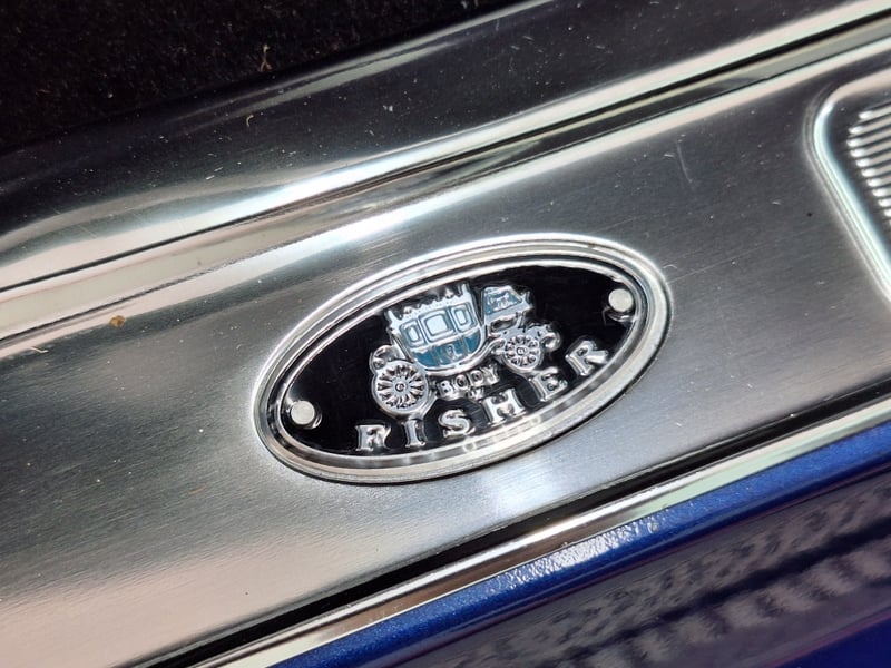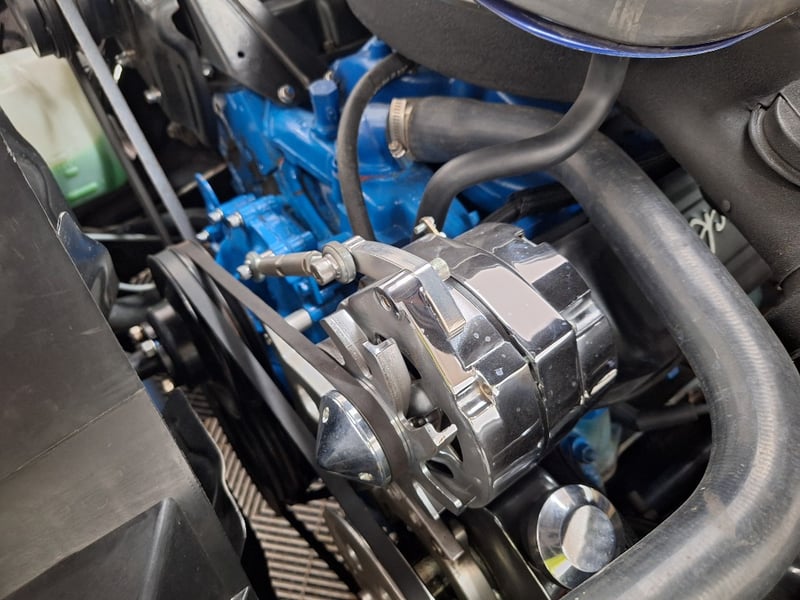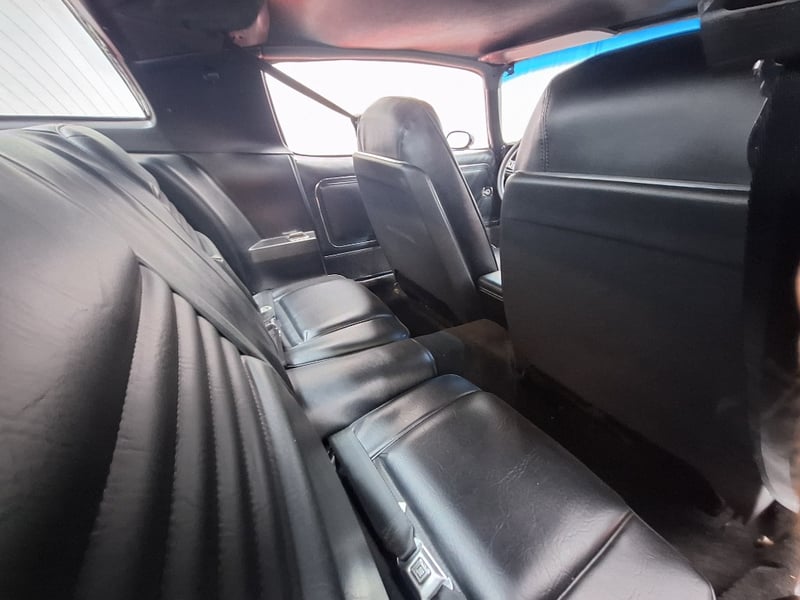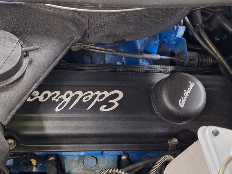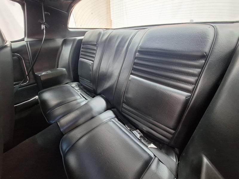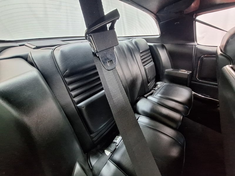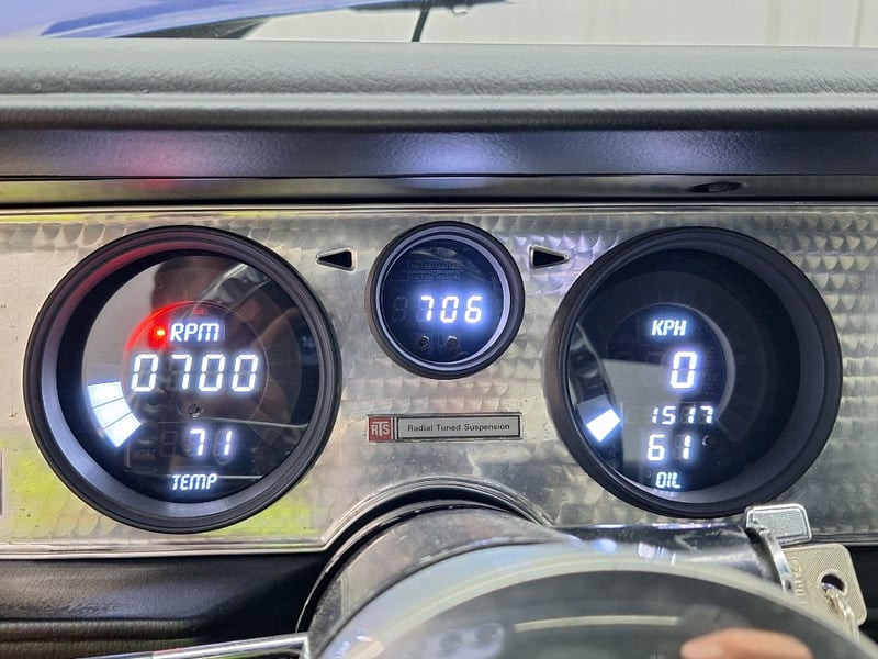Inside, the cabin was restored in 2021 and now features black upholstery with silver accents. Both front and rear bucket-style seats have been retrimmed, with lap/sash belts fitted up front. A polished three-spoke steering wheel sits ahead of an aluminium swirl-finish dashboard fascia, complemented by an Intellitronix Firebird digital dash upgrade. Entertainment is handled by a Retrosound unit feeding Alpine 6x9 speakers. The interior also benefits from new carpet, replaced headlining, a refurbished centre console and a neatly trimmed boot area.