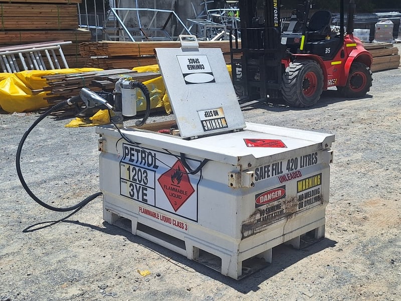 Description/Extras: 420L Safe Fill Unleaded Bunded Tank, High Performance Heavy Duty Pump, Connects To 12v Battery, Forklift Lift Pockets, Safety Stickers, Approximately 730mm (H) x 800mm (W) x 1360mm (L)