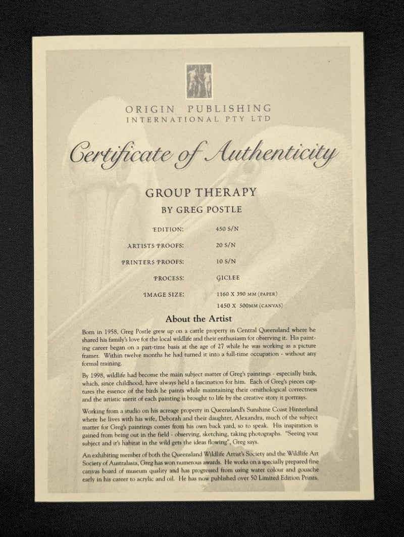 GREG POSTLELimited Edition Lithograph On PaperTitle: Group TherapyImage Size: 38cm x 115cmFrame Size: 60cm x 136cmEdition: 150 / 450Signature Details: Signed Lower LeftAccompanied By A Certificate Of AuthenticityCondition: Good - Refer To Images584970+4