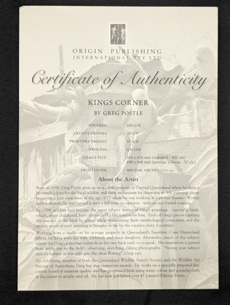 GREG POSTLELimited Edition Giclee On PaperTitle: Kings CornerImage Size: 62cm x 51cmSheet Size: 73cm x 62cmEdition: 363/450Signature Details: Signed Lower LeftAccompanied By A Certificate Of AuthenticityCondition: Good - Refer To Images584970+6