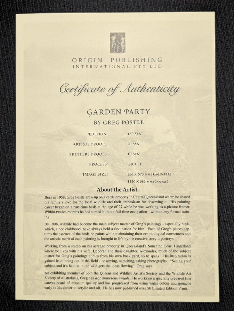 GREG POSTLELimited Edition Lithograph On PaperTitle: Garden PartyImage Size: 52cm x 85cmFrame Size: 71cm x 105cmEdition: 235 / 450Signature Details: Signed Lower LeftAccompanied By A Certificate Of AuthenticityCondition: Good - Refer To Images584970+3
