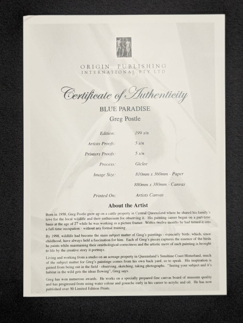 GREG POSTLELimited Edition Giclee On PaperTitle: Blue ParadiseImage Size: 36cm x 81cmSheet Size: 42cm x 91cmEdition: 63/199Signature Details: Signed Lower LeftAccompanied By A Certificate Of AuthenticityCondition: Good - Refer To Images584970+24