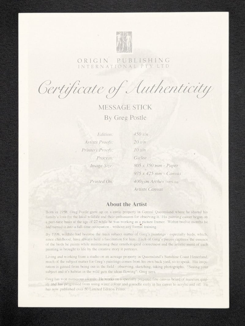 GREG POSTLELimited Edition Giclee On PaperTitle: Message StickImage Size: 35cm x 80cmSheet Size: 41cm x 91cmEdition: 163/450Signature Details: Signed Lower LeftAccompanied By A Certificate Of AuthenticityCondition: Good - Refer To Images584970+19