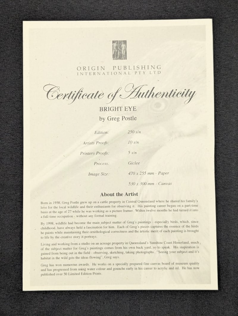 GREG POSTLELimited Edition Giclee On PaperTitle: Bright EyeImage Size: 26cm x 47cmSheet Size: 30cm x 52cmEdition: 63/250Signature Details: Signed Lower RightAccompanied By A Certificate Of AuthenticityCondition: Good - Refer To Images584970+31