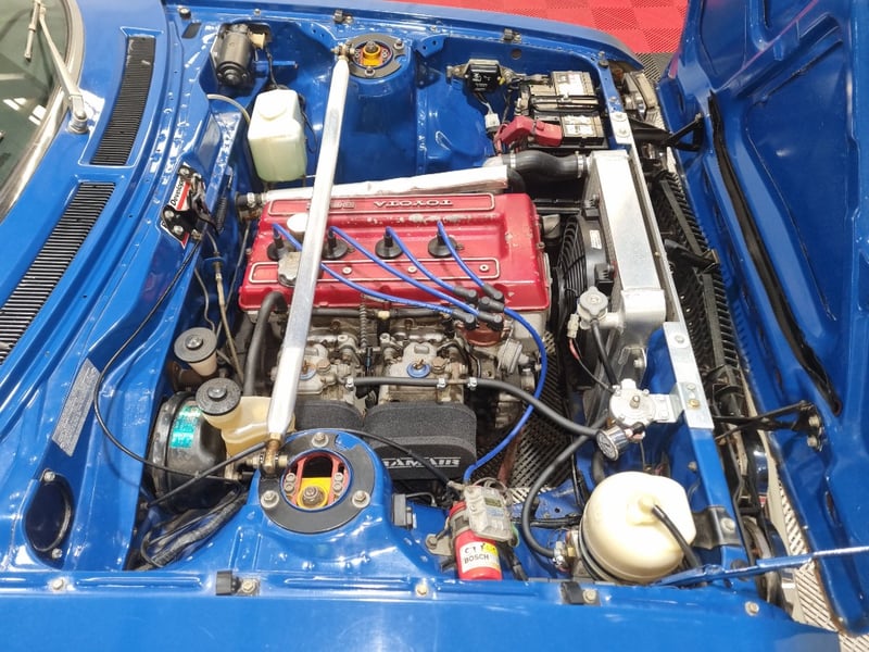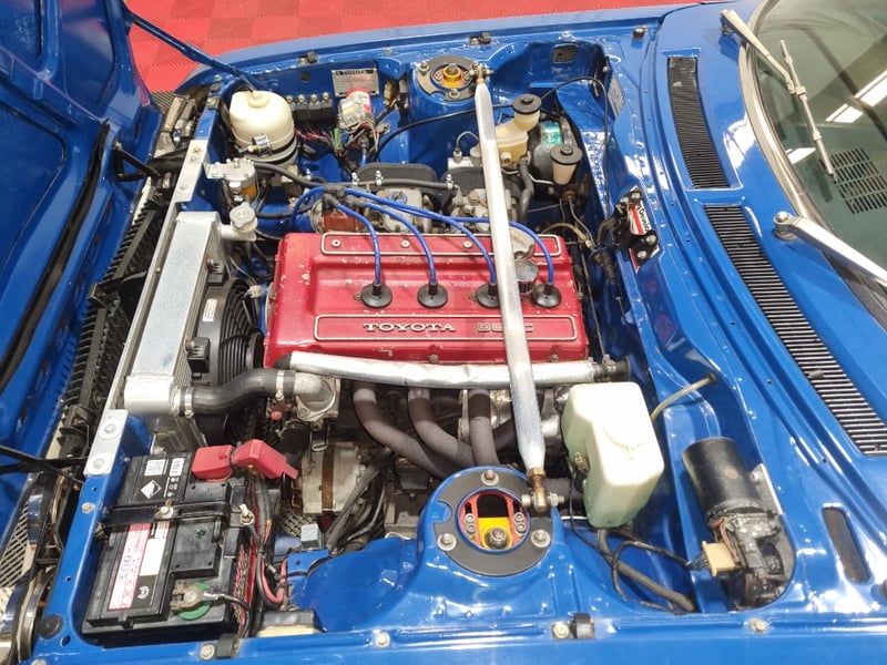 A modified and restored TA22 Celica finished in Blue, built as a GTV-style replica and enhanced with extensive engine, suspension, braking, and driveline upgrades. Odometer indicates 91,305 km.