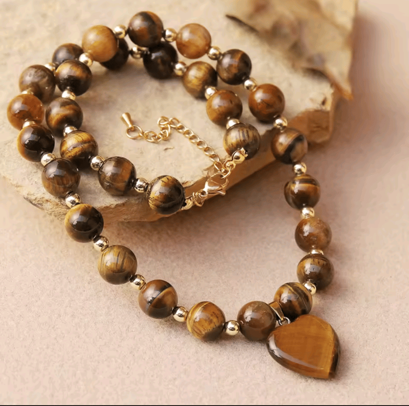 TIGERS EYE BEAD NECKLACE WITH HEART PENDANT Condition: Good - Refer Images 0162980+30FC
