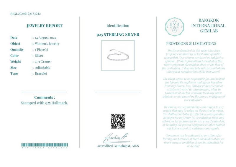 925 STERLING SILVER BRACELET - WITH CERTIFICATE Gemstone : 925 Sterling SilverCertificate Number : Bigl20240122133242Item Total Weight : 4.71 GramsMain Stone Color : SilverSize : AdjustableComments : Stamped With 925 Hallmark. ✻ Verify Report Online At Www.Bangkokinternationalgemlab.Co 0+51