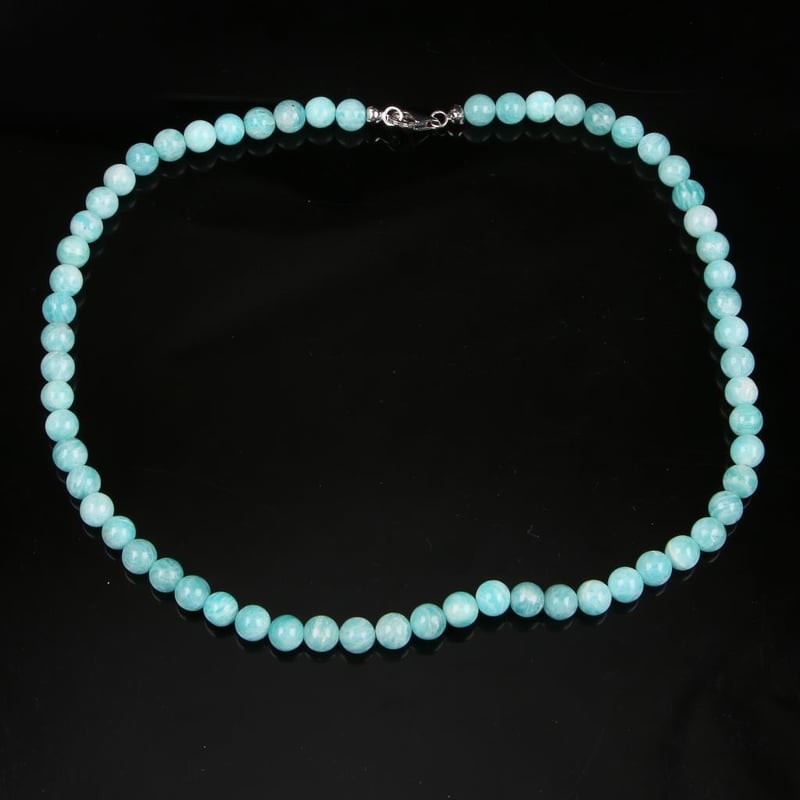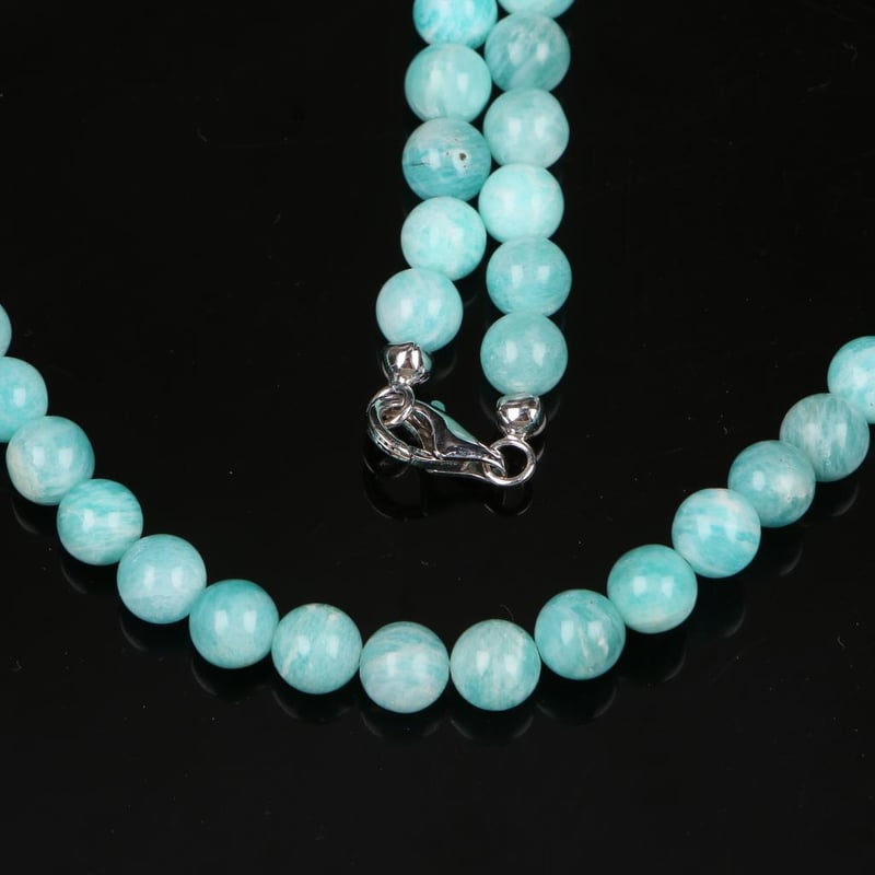 Exquisite Amazonite Bead Necklace with Ghungroo and Fish LockIndulge in the serene beauty of this enchanting Amazonite Bead Necklace, meticulously crafted to elevate any jewelry collection. Comprising approximately 58 meticulously polished plain ball beads, each measuring around 7.50x7.70mm, this necklace showcases the captivating hues of Amazonite, ranging from tranquil greens to striking blues, reminiscent of sunlit tropical waters. The necklace is elegantly finished with a stunning 13.00mm fish lock, ensuring not only security but also an aesthetic charm that enhances the overall design. The addition of ghungroo beads introduces a playful jingle, evoking a sense of movement and grace with every step you take.Perfect for both casual wear and formal occasions, this versatile piece is a celebration of natural beauty and artisanal craftsmanship. Let the calming energy of Amazonite resonate with your spirit, making this necklace not just an accessory, but a cherished talisman of tranquility. Don’t miss the chance to own this exquisite piece at auction—where elegance meets nature’s finest artistry.