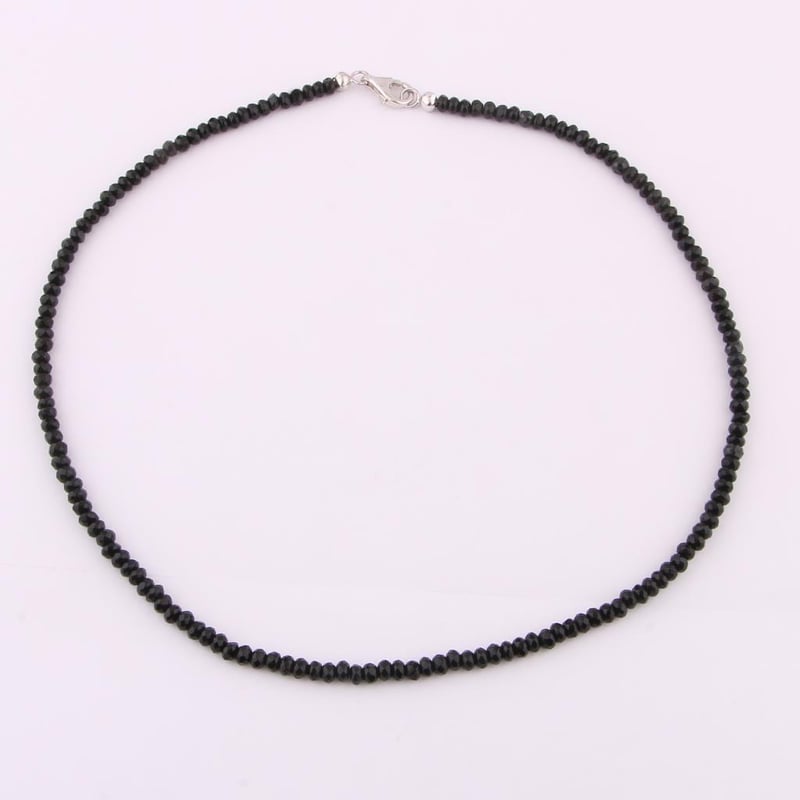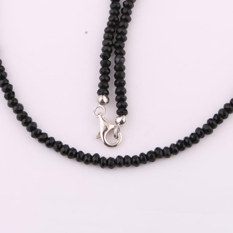 Elegant Black Zade Faceted Bati Beads Necklace with Ghungroo Indulge in the captivating allure of this exquisite Black Zade Faceted Bati Beads Necklace, a true testament to the artistry of fine jewelry. With approximately 156 meticulously crafted beads, each measuring between 4.00x2.70mm and 3.90x2.60mm, this necklace is a harmonious blend of sophistication and timeless elegance. The deep, lustrous black hue of the Zade stones is beautifully accentuated by their flawless faceting, reflecting light in a dance of subtle brilliance. This enchanting piece is not just a necklace; it is a statement of refined taste and an homage to the craftsmanship of artisanal jewelry. Adorned with a sturdy yet elegant fish lock measuring 13.00mm, this necklace ensures both security and style, making it perfect for any occasion—from a glamorous evening out to an intimate gathering. The addition of the traditional ghungroo charms adds a delightful touch, creating a gentle jingle that enhances the wearer's grace with every movement. Elevate your jewelry collection with this stunning Black Zade Faceted Bati Beads Necklace, where luxury meets tradition in a piece that is bound to become a cherished heirloom. Don’t miss your chance to own a true work of art that embodies elegance and sophistication.
