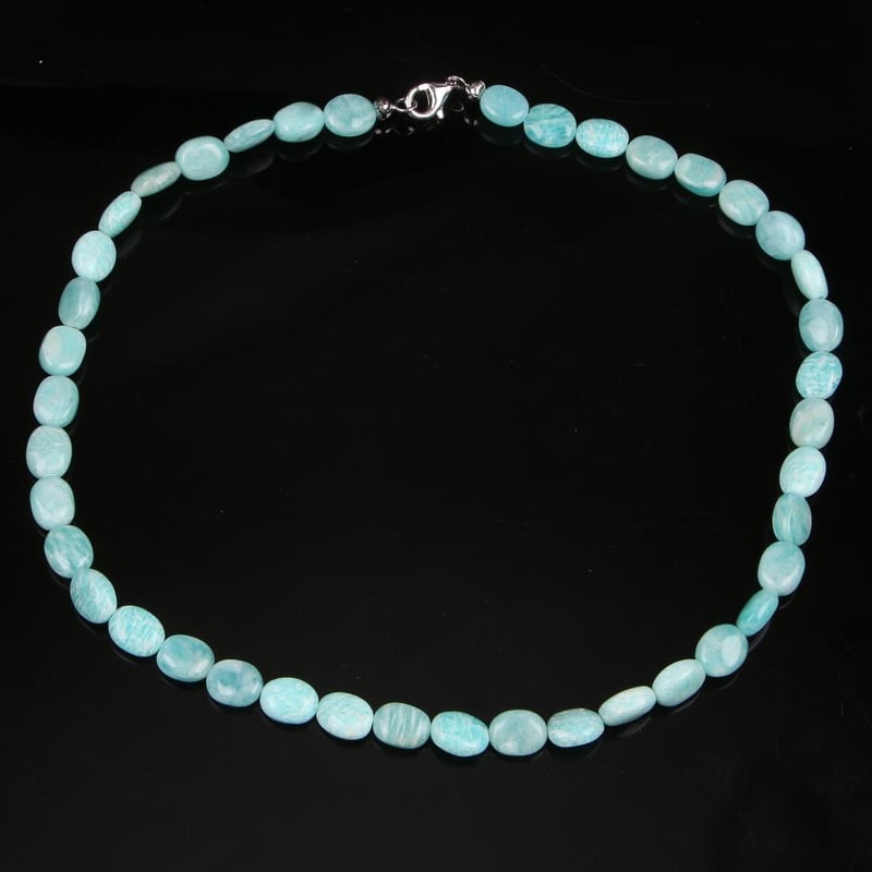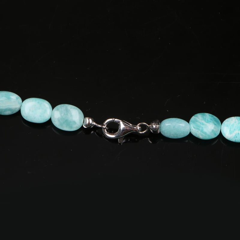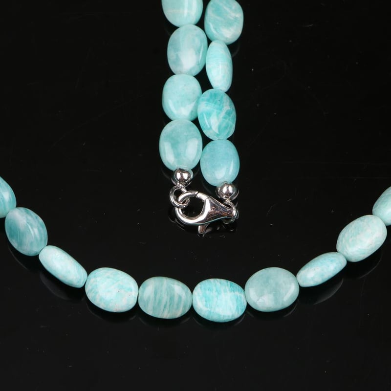 Exquisite Amazonite Tumble Necklace with Fish Lock & Ghungroo BeadsIndulge in the serene beauty of nature with this enchanting Amazonite Plain Tumble Necklace, a stunning adornment that captures the essence of tranquility. Comprising approximately 41 meticulously polished pieces, each stone radiates a soothing blend of turquoise and green hues, reminiscent of the lush landscapes of the Amazon rainforest. With dimensions ranging from 10.50 x 8.45mm to 10.50 x 8.00mm, these thoughtfully curated tumbles are strung together to create a harmonious flow, ensuring a comfortable fit that drapes elegantly around the neck. The pièce de résistance is the artisanal fish lock, measuring 13.00mm, which not only secures the necklace but also adds a touch of whimsy and charm. Complemented by delicate ghungroo beads that gently jingle with movement, this necklace is perfect for both casual outings and elegant soirées. Each piece tells its own story, inviting admiration and sparking conversation. Elevate your jewelry collection with this captivating necklace that embodies both style and sophistication—an essential piece for the discerning connoisseur.