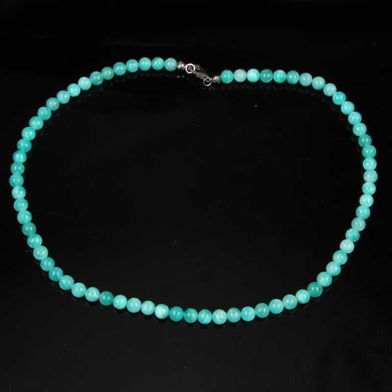 Enchanting Amazonite Beads Necklace with Ghungroo Accent Discover the serene beauty of the natural world with this exquisite Amazonite Plain Ball Beads Necklace. Comprising approximately 66 meticulously polished beads, each measuring around 6.50mm, this piece resonates with the calming hues of turquoise and green reminiscent of tranquil waters and lush landscapes. The necklace is gracefully finished with a fish lock measuring 13.00mm, ensuring both security and ease of wear. Adding a touch of traditional allure, the ghungroo charm dangles gently, creating a delicate jingling sound that enchants with every movement. This captivating accessory not only embodies elegance but also carries the soothing properties of Amazonite, known for its ability to promote harmony and balance. Whether worn for a special occasion or as an everyday statement piece, this Amazonite necklace is a perfect blend of artistry and nature, inviting admiration and awe with its effortless grace. Embrace the essence of tranquility and elevate your jewelry collection with this stunning piece, a true homage to the beauty of the Earth.