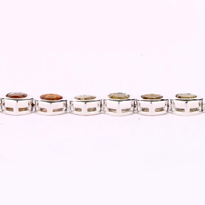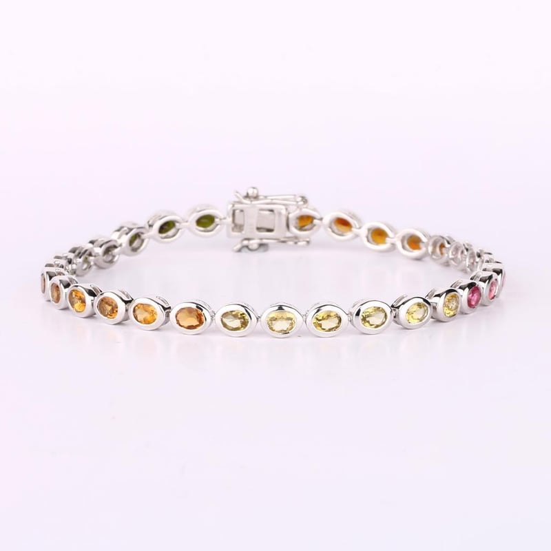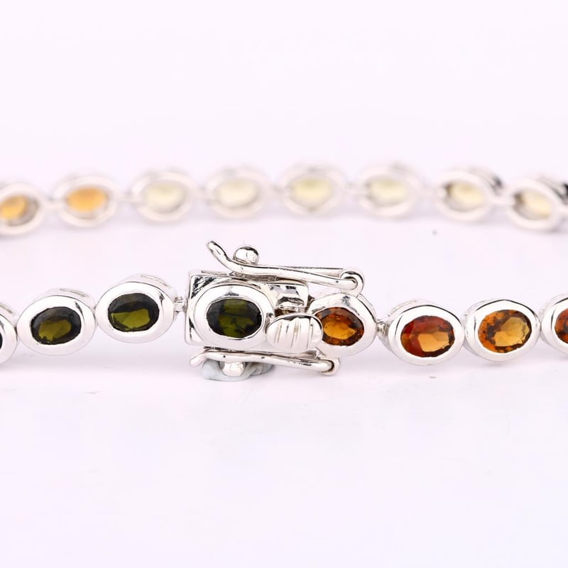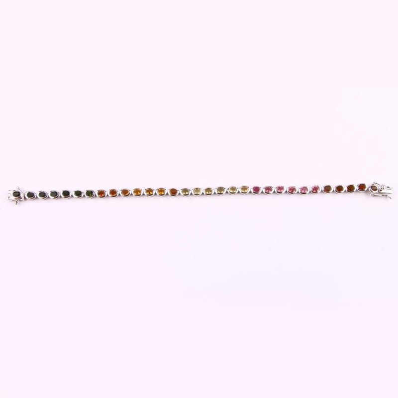 Vibrant Tourmaline Harmony Bracelet: A Symphony of Color Indulge in the exquisite beauty of this one-of-a-kind Vibrant Tourmaline Harmony Bracelet, a dazzling piece that showcases an enchanting array of tourmaline gemstones. This bracelet features a captivating collection of 31 meticulously selected oval tourmalines, each measuring 4x3mm, in a stunning palette that captures the essence of nature’s brilliance. The bracelet is adorned with seven green tourmalines, radiating a lush, verdant glow that evokes the tranquility of a sun-drenched forest. Complementing this, seven orange tourmalines burst forth like the vibrant hues of a sunset, infusing warmth and energy into the design. Six yellow tourmalines glimmer like rays of golden sunshine, while six pink tourmalines add a romantic touch reminiscent of blooming florals. Completing this breathtaking ensemble are five brown tourmalines, grounding the piece with a rich, earthy elegance. Crafted with precision, this bracelet is secured with a sophisticated box lock featuring a double safety clip, ensuring both beauty and security. The alternate stone setting enhances the visual allure, allowing each gemstone to shine in its unique light. Whether gracing your wrist at an elegant soirée or adding a touch of luxury to your everyday attire, this bracelet is not just a piece of jewelry; it’s a statement of style and sophistication. Elevate your collection with this harmonious symphony of color, where each tourmaline tells a story of grace and beauty. Don’t miss the opportunity to own this extraordinary masterpiece at the upcoming auction.