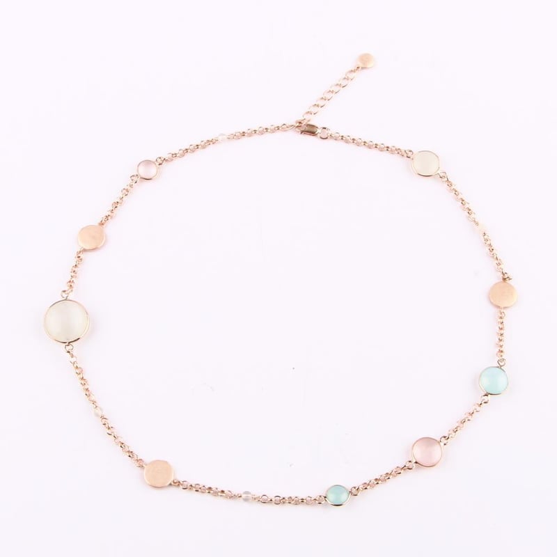 Celestial Harmony: Exquisite Moonstone and Chalcedony Bracelet Indulge in the ethereal beauty of this meticulously crafted bracelet, a stunning celebration of nature's finest gems. Designed to enchant, it features an enchanting array of pastel-hued stones, each thoughtfully selected for their unique allure. At the heart of this piece are two exquisite white moonstones, one in a generous 12.00mm almond shape and the other a delicate 8.00mm—both radiating a soft luminescence that captures the light with every movement. Their gentle glimmer is artfully complemented by the serene sea blue chalcedony stones, unprocessed and in their natural pastel state, with sizes of 6.00mm and 8.00mm, exuding a tranquil oceanic charm. Adding to the harmonious palette, two rose quartz stones, tenderly hued and shaped in the same almond silhouette, bring a touch of romance and warmth. The 6.00mm and 8.00mm rose quartz pieces serve as a beautiful reminder of love and compassion. To enhance this luxurious composition, the bracelet features four full-drilled white moonstone beads and three brushed texture discs, all meticulously placed to create an elegant rhythm. The design is finished with a smooth, matte-finished metal chain, complete with a lobster lock for secure wear, ensuring comfort and style. The bracelet measures a total length of 38cm, with a graceful 3cm extension, allowing for a personalized fit. With a refined aesthetic and a thoughtful arrangement—each stone separated by a delicate 1.50cm gap—this piece promises to be a standout addition to your jewelry collection. Embrace the celestial elegance of the White Moonstone and Chalcedony Bracelet, where sophistication meets natural beauty, making it the perfect accessory for any occasion.