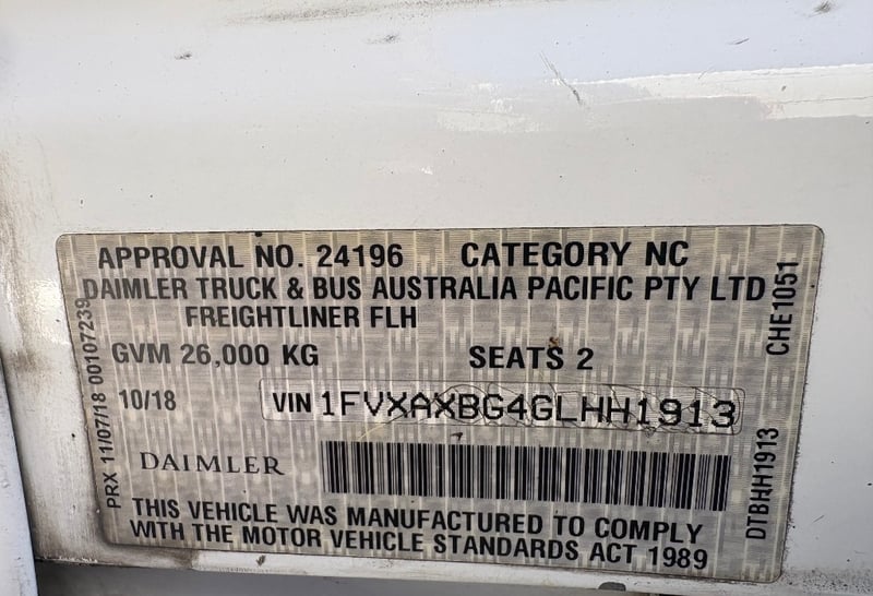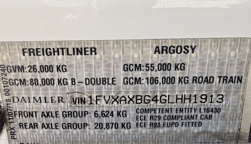 2018 Freightliner Argosy Prime MoverYear: 2018Make: FreightlinerModel: ArgosyBody: Prime MoverOdometer: Indicating 1,141,592 Kilometers (when photographed)Engine: Cummins X15, Turbo DieselTransmission: AutomaticColour: WhiteSeats: 2Configuration: 6x4Suspension: Air BagGVM: 26,000 KgGCM: 80,000 KgRoad Train: 106,000 kg VIN: 1FVXAXBG4GLHH1913ENG No: 79856126 (As per PPSR)Description/extras: Jost Turntable, Air Conditioning, Power windows, Central locking, CD player. Location: Munruben QLDContact: Jamie 0486 045 295Sold unregistered