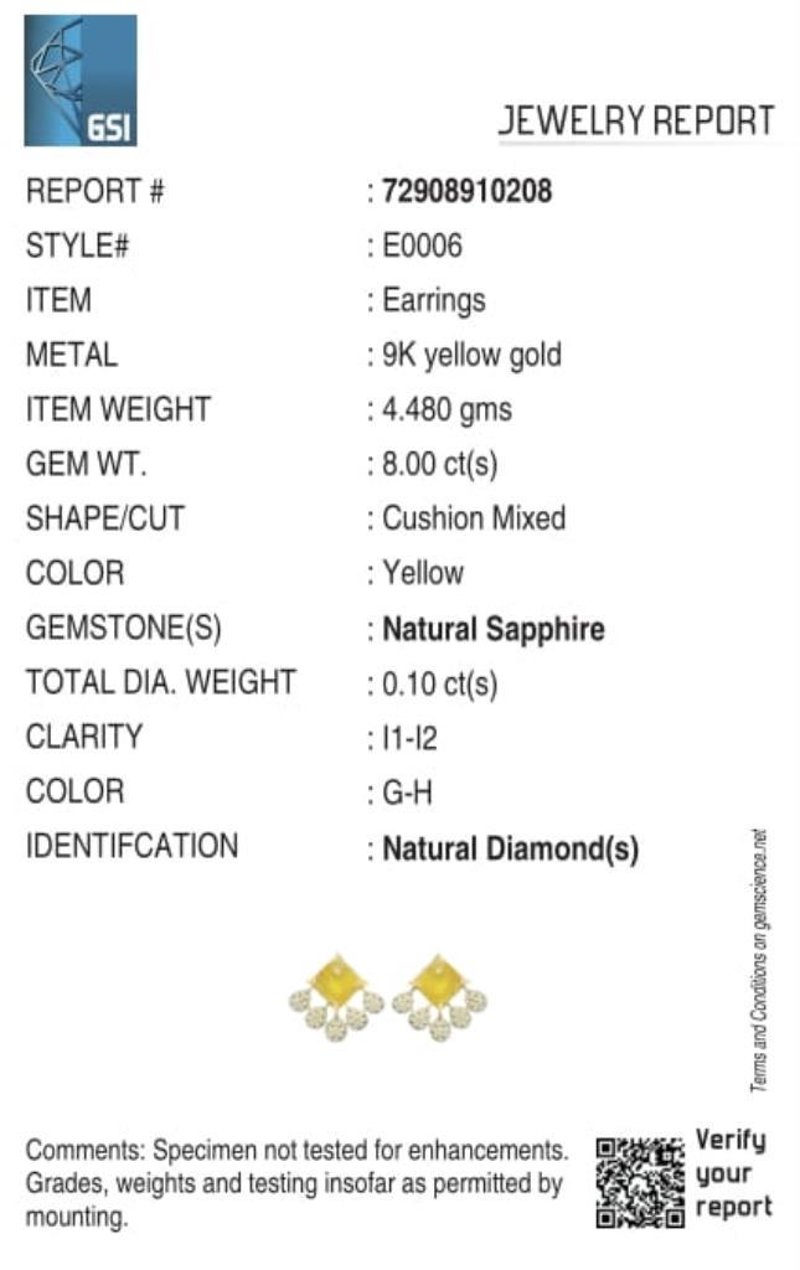 9CT YELLOW GOLD NATURAL YELLOW SAPPHIRE & DIAMOND EARRINGS Weight Of The Item: 4.48 GFineness Of Metal(S): Yellow Gold 9KtThe Earrings Consists Of (2) Cushion Brilliant Natural Yellow Sapphire. Surrounding The Main Stones Are Round Brilliant Cut Natural Diamonds.Identification: Natural Yellow SapphireColor: YellowShape: Cushion Brilliant CutNo. Of Stone: 2Dimension: 8 Mm X 8 Mm X 4.8 MmWeight: 8 CaratsCut: Very GoodIdentification: Natural DiamondShape: Round Brilliant CutWeight: 0.1 CtsCertificates Are Provided By Gemological Science International (Gsi), An Independent Third-Party Gemological Laboratory Based In The Usa And Recognised Among The Top 10 Gem Labs Globally Condition: Good - Refer Images 0160841+35