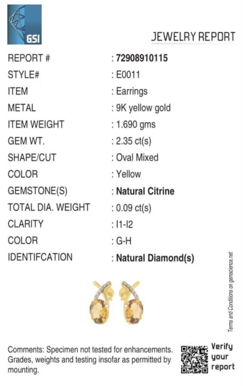9CT YELLOW GOLD NATURAL CITRINE & DIAMOND EARRINGS Weight Of The Item: 1.69 GFineness Of Metal(S): Yellow Gold 9KtThe Earrings Consists Of (2) Oval Brilliant Natural Citrine. Surrounding The Main Stones Are Round Brilliant Cut Natural Diamonds.Identification: Natural CitrineColor: YellowShape: Oval Brilliant CutNo. Of Stone: 2Dimension: 8 Mm X 6 Mm X 4.8 MmWeight: 2.35 CaratsCut: Very GoodIdentification: Natural DiamondShape: Round Brilliant CutWeight: 0.09 CtsCertificates Are Provided By Gemological Science International (Gsi), An Independent Third-Party Gemological Laboratory Based In The Usa And Recognised Among The Top 10 Gem Labs Globally Condition: Good - Refer Images 0160841+64