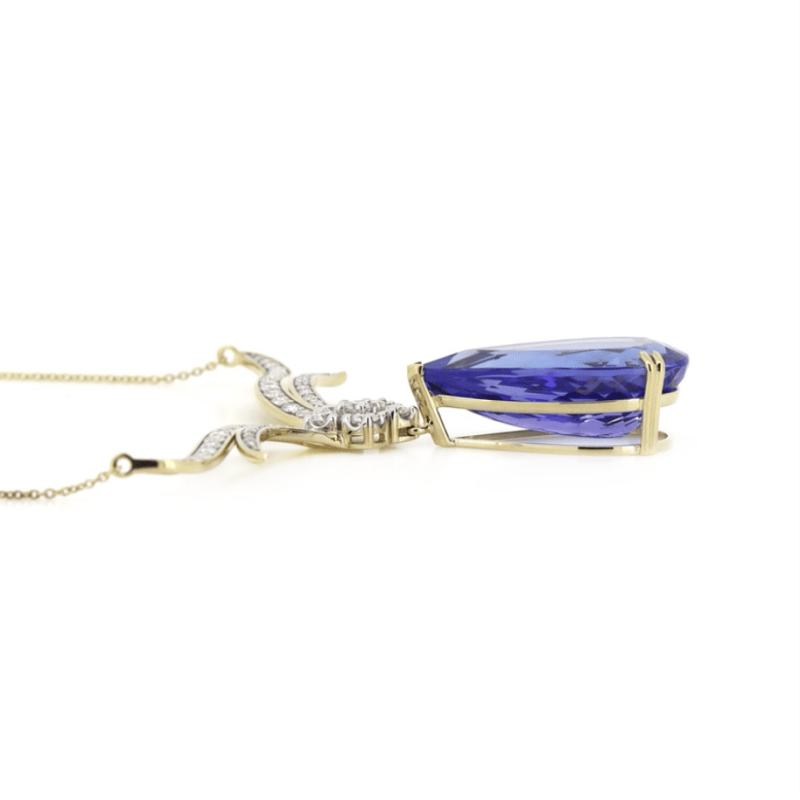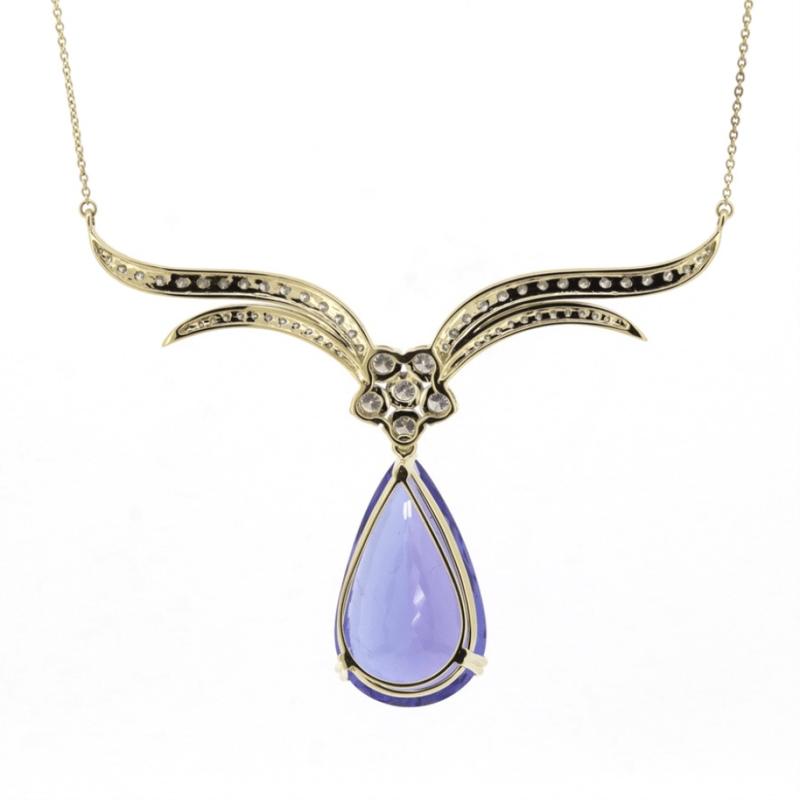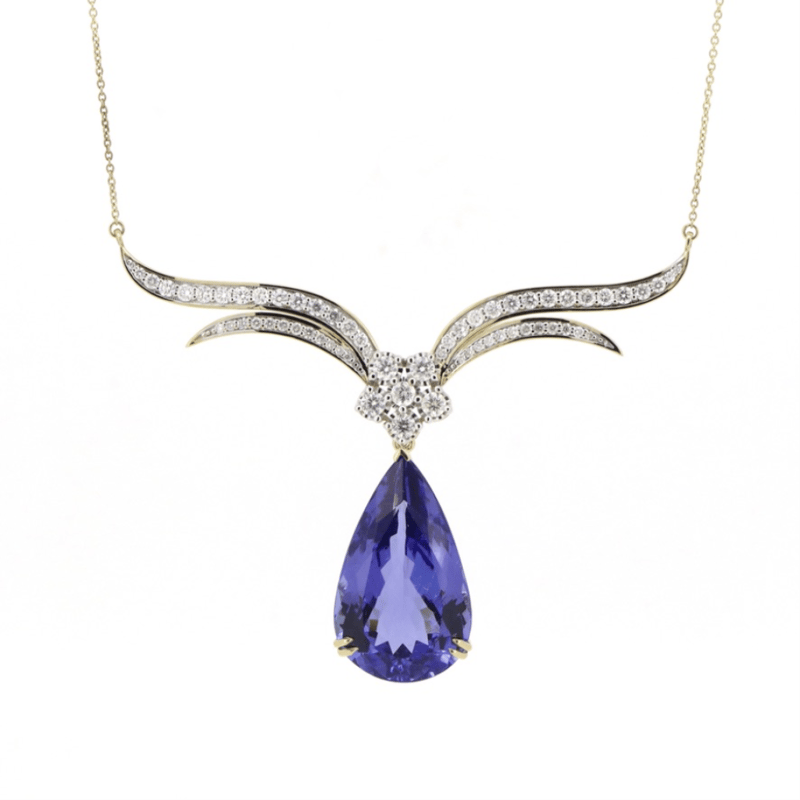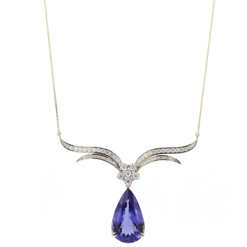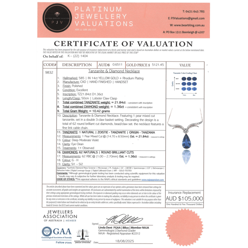 The Design Features, One Pear Cut, Deep Moderate Violet, Tanzanite (21.84Ct, Eye Clean Clarity, Enhanced), Claw Set. Embellishing The Design Are, 62 Round Brilliant Cut, Diamonds (1.36Ct Tdw, G-H Colour, Si1-Si2 Clarity), Bead Set. The Necklace Has A Cable Link Chain With A Lobster Claw Clasp. Necklace Length Is 50Cm.