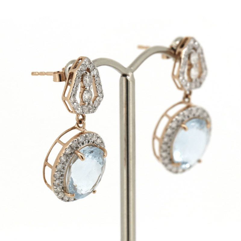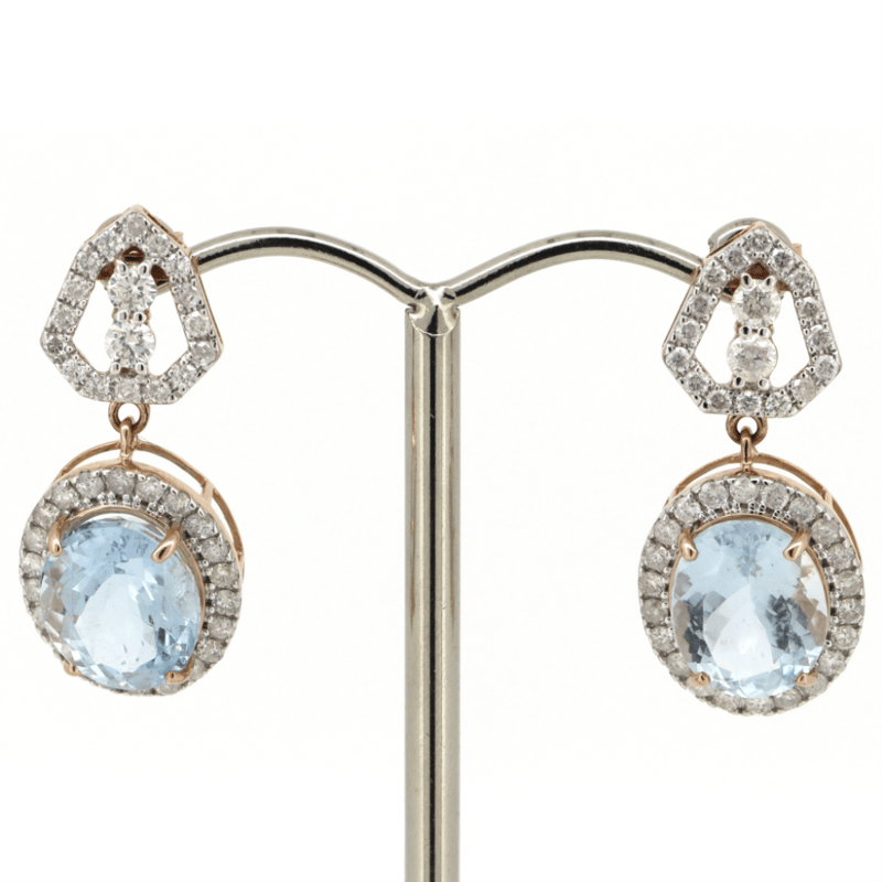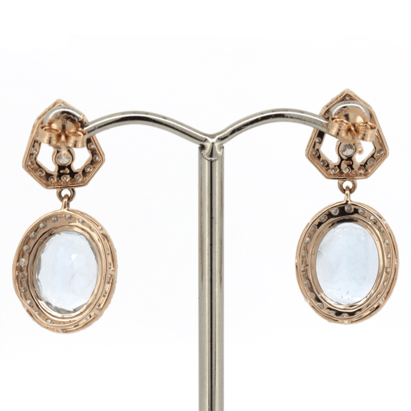 14K ROSE GOLD, AQUAMARINE AND DIAMOND, DROP EARRINGS