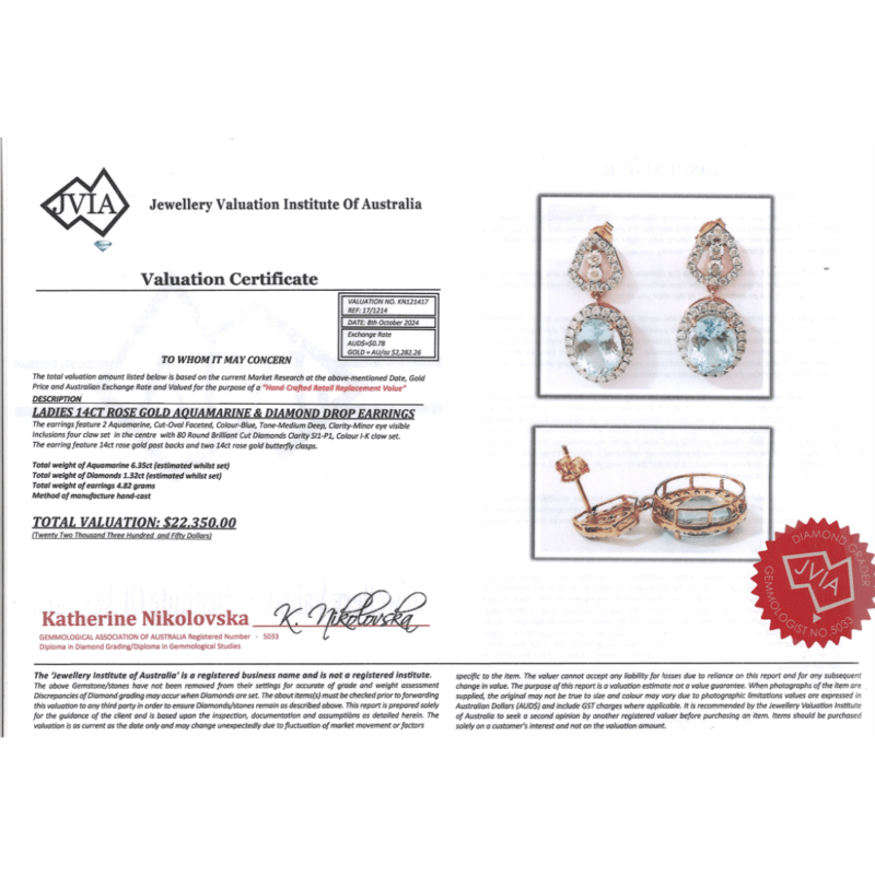 The Centres Feature, 2 Oval Faceted Cut, Medium Deep Blue, Aquamarines (6.35Ct Tsw, Minor Eye Visible Inclusions), 4 Claw Set. Surrounding The Centres In Halos And Decorating The Studs Are, 80 Round Brilliant Cut, Diamonds (1.317Ct Tdw, I-K Colour, Si1-P1 Clarity), Claw Set. The Earrings Feature 14K Rose Gold Post Backs And 2 14K Rose Gold Butterfly Clasps.