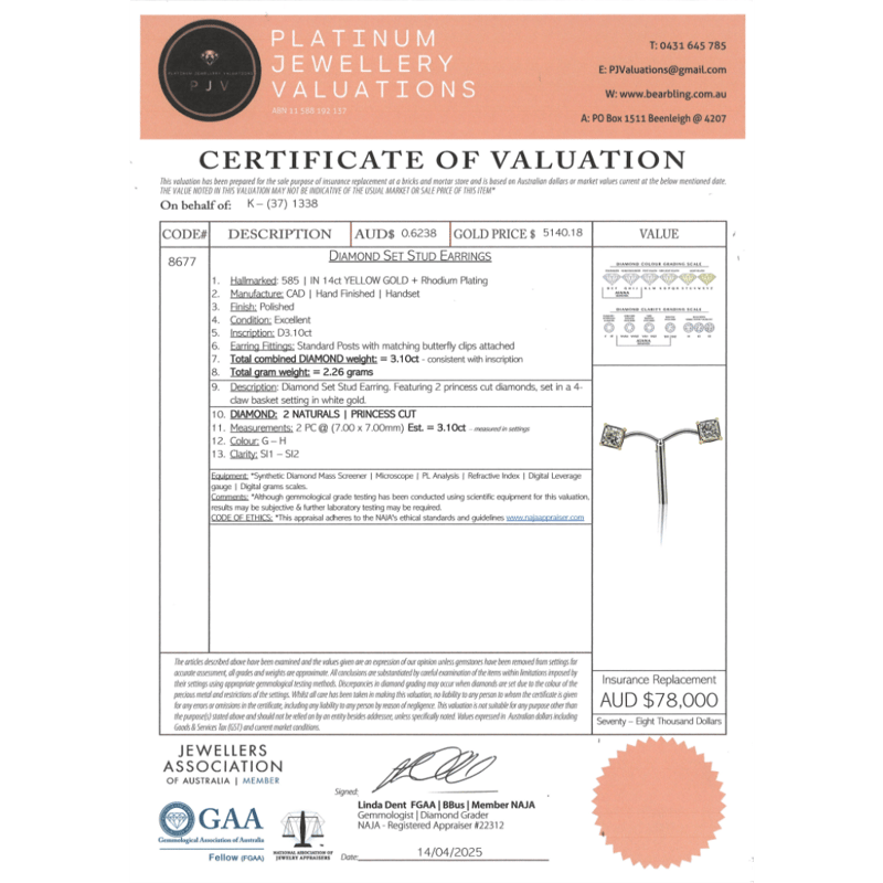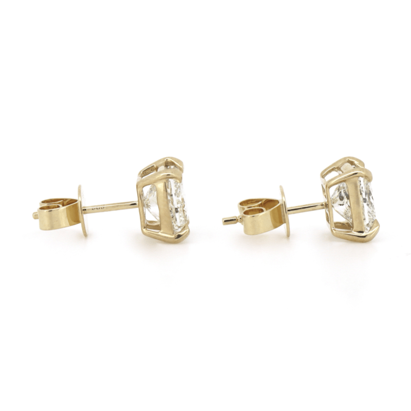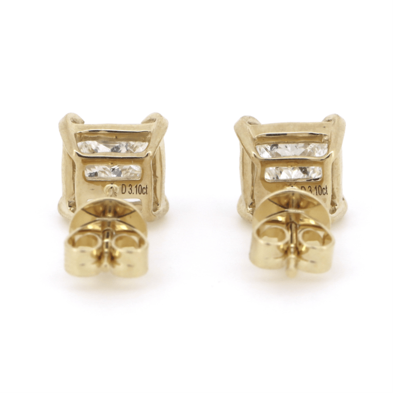 The Centres Feature, 2 Princess Cut, Diamonds (3.10Ct Tdw, G-H Colour, Si1-Si2 Clarity), Claw Set. Earrings Have Post Backs, 14K Yellow Gold Butterfly Clasps.